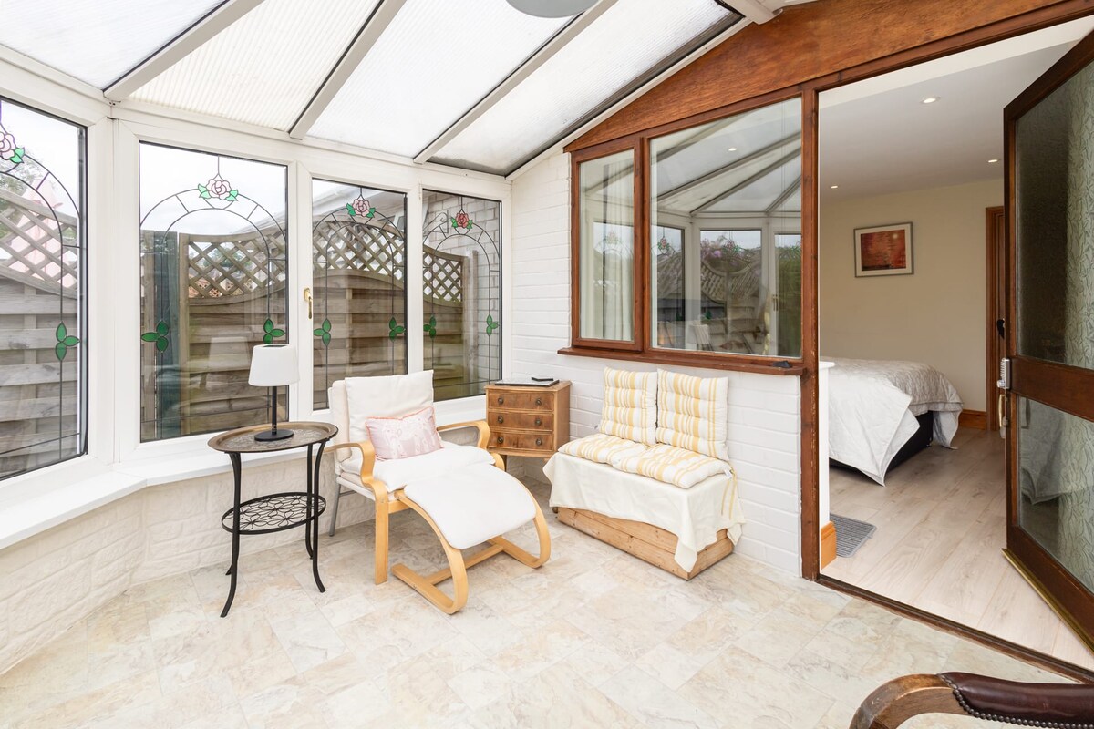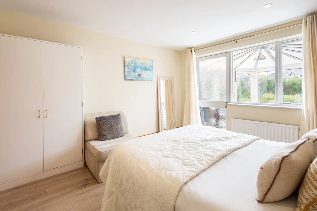 The bungalow has two bedrooms. Head to the master bedroom and you’ll find a comfortable double bed and a traditional wardrobe. Open the curtains and step through the door and you’ll enter a conservatory which showcases the beautiful garden on offer at Riverbank. Wooden flooring completes the look in the bedroom.