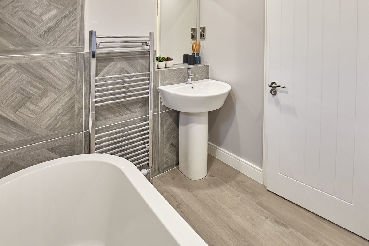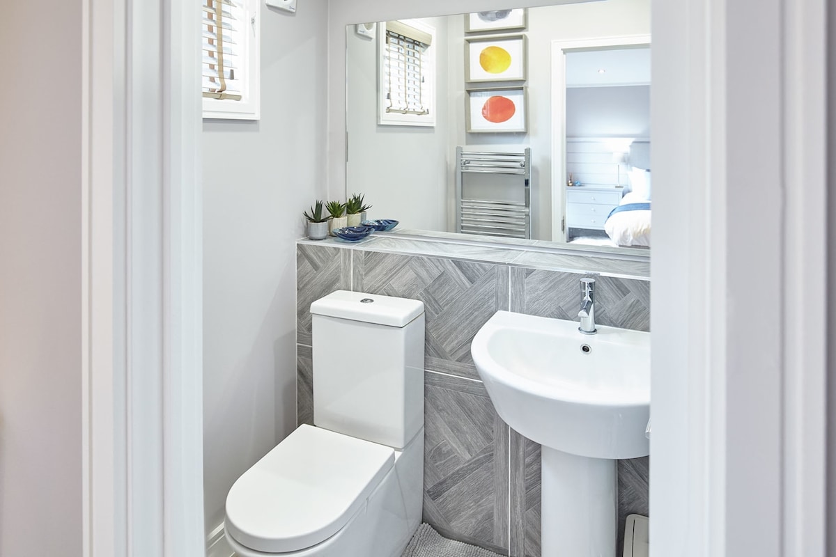 Modern and stylish, the family bathroom has a deep freestanding bathtub with a handheld shower hose, as well as a WC and wash basin. The king bedroom has its own ensuite with a shower, WC and basin. Towel rails are also available in both bathrooms.