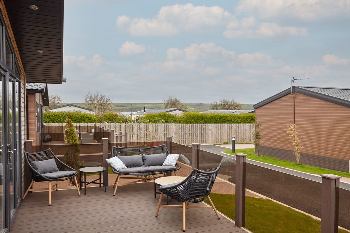 Puffins Rest has a bright and cosy living area with two comfy sofas and a large window flooding the room with light. Fully equipped for self-catering staycations, the kitchen diner has everything you could need to prepare and enjoy meals together, and there is even cutlery and dishes for children available. You’ll also find a cosy log burner in the space.Outside you’ll find an enclosed, south facing patio area. There is wrap around secure decking with a south east and west facing terrace allowing daylong sunshine, and a largely grassed garden to the west side of the lodge. You'll be able to catch the sun all day long when outside at Puffin's Rest.