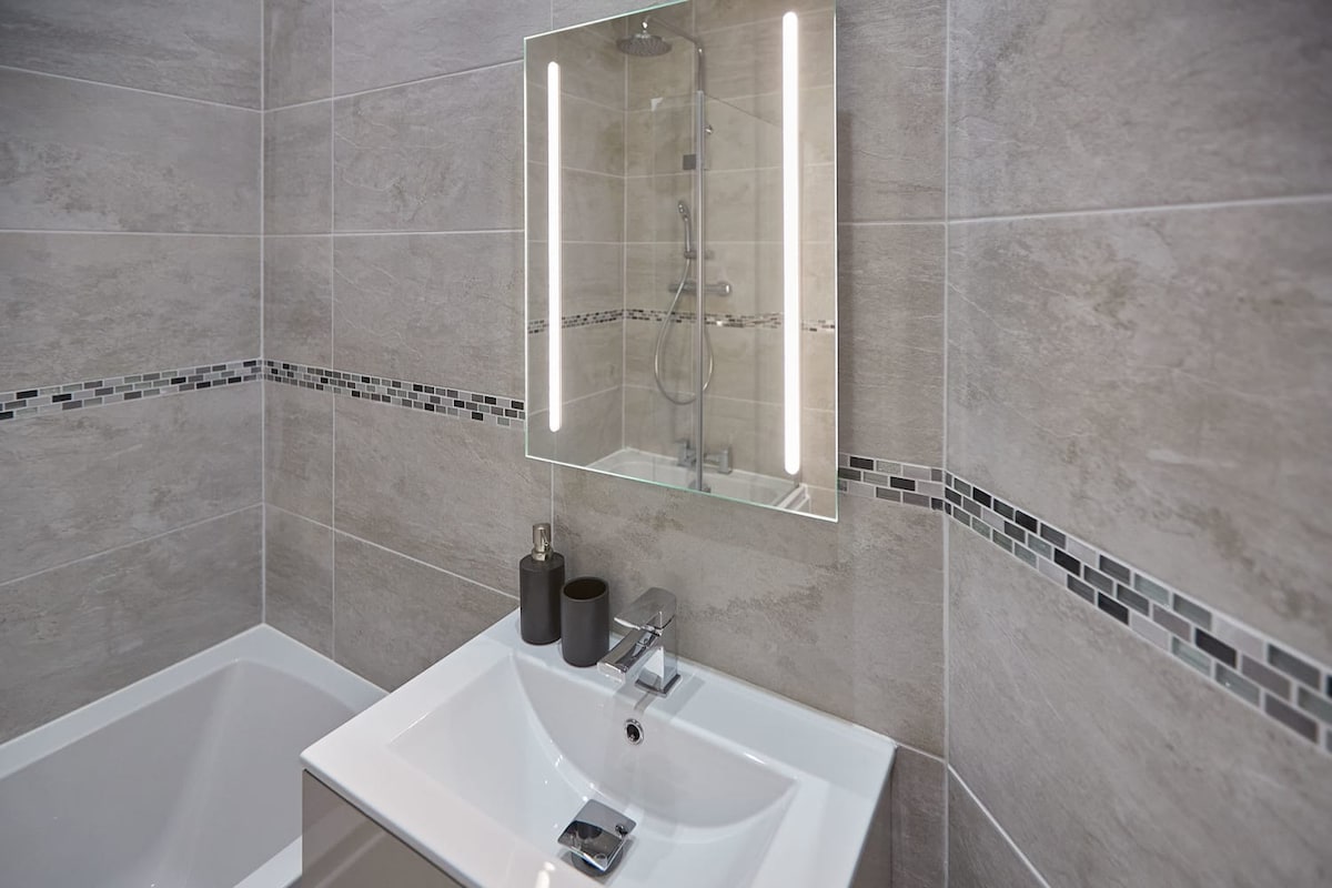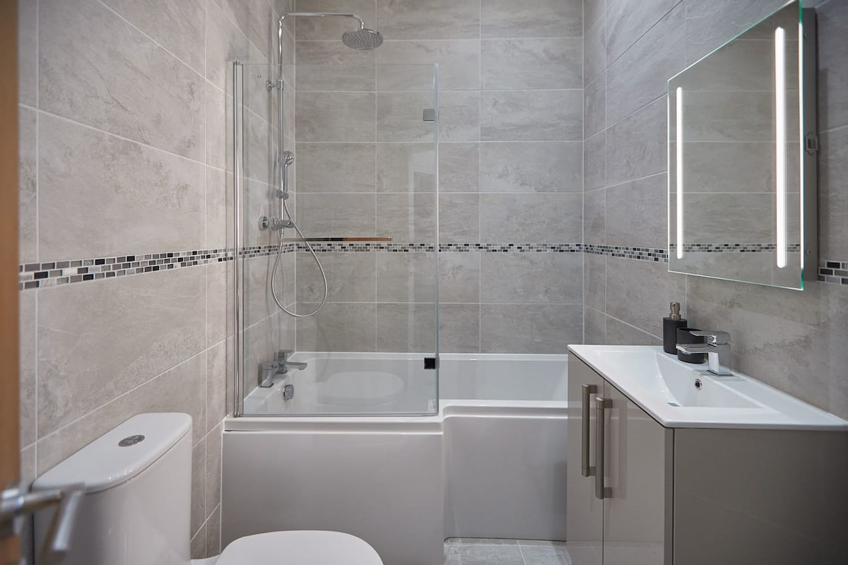 Green View has a modern and clean bathroom. Take a soak in the L shaped bathtub or start your day with a refreshing shower. A vanity unit, WC and light up mirror complete the look.