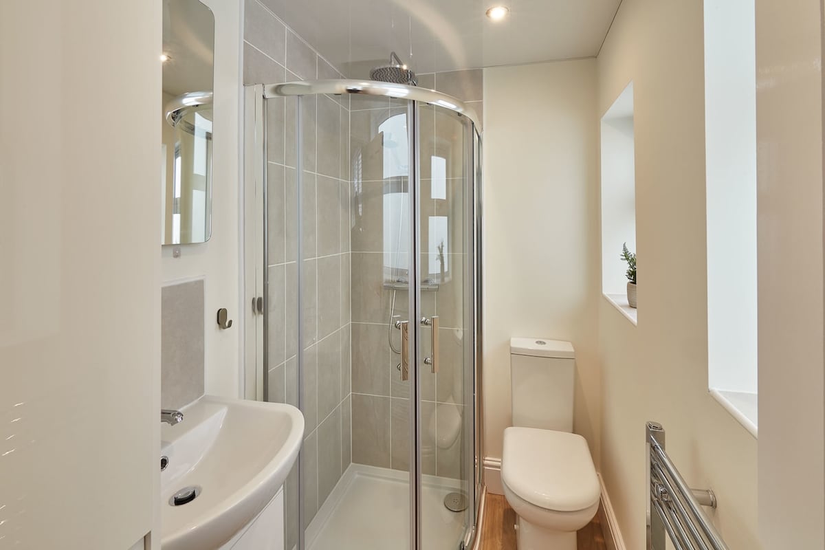 The family bathroom is located on the ground floor and includes a walk in shower, WC and basin.