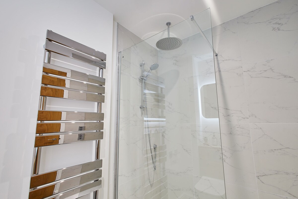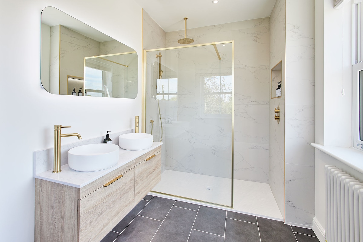 Modern and sophisticated, the family bathroom has a freestanding bath with handheld shower, separate walk-in shower, WC and basin. While soaking in the bathtub, you can enjoy views towards Roseberry Topping.