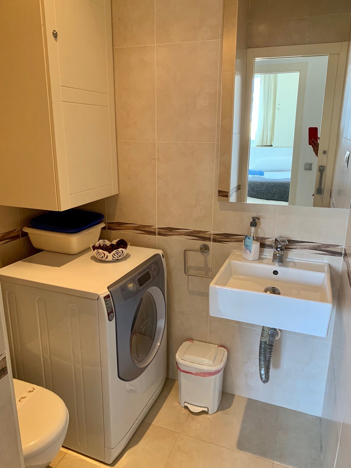 Modern, light and airy, recently refurbished in light colors that will make your stay calm and relaxing, open plan well stocked kitchen with all appliances, should you fancy to cook and bathroom with bath.