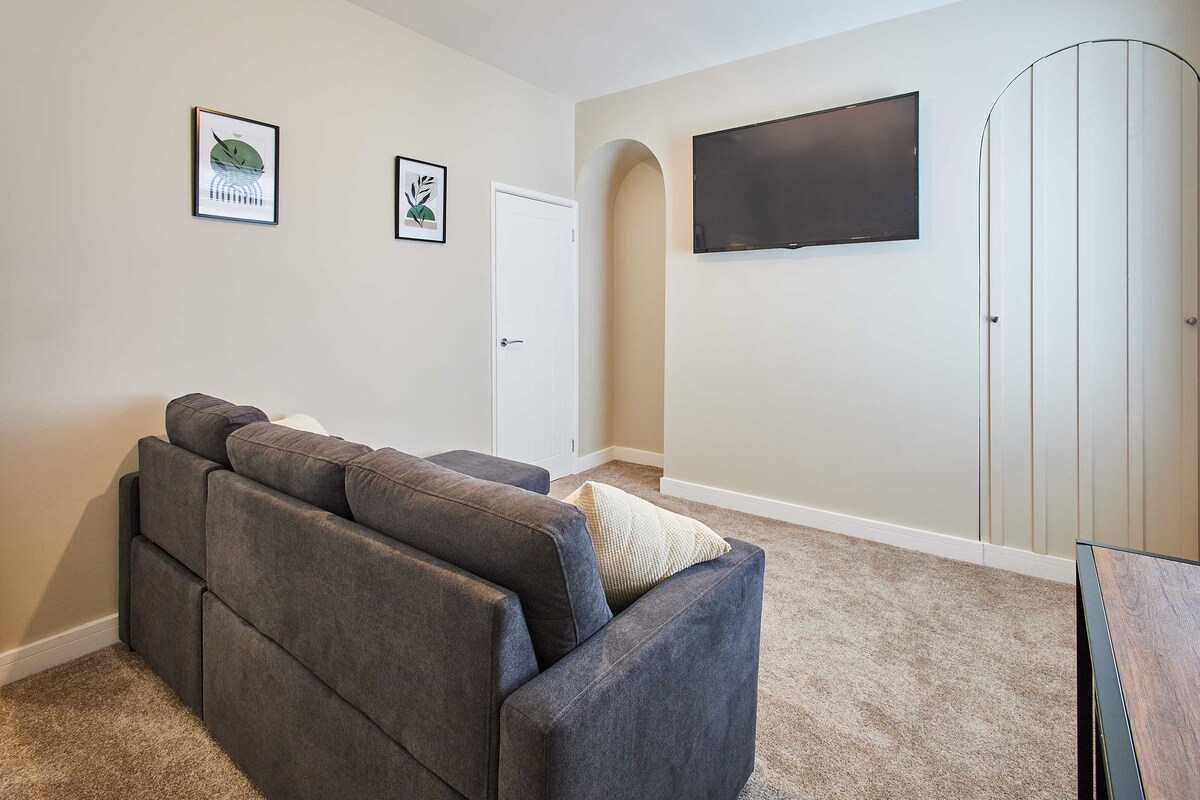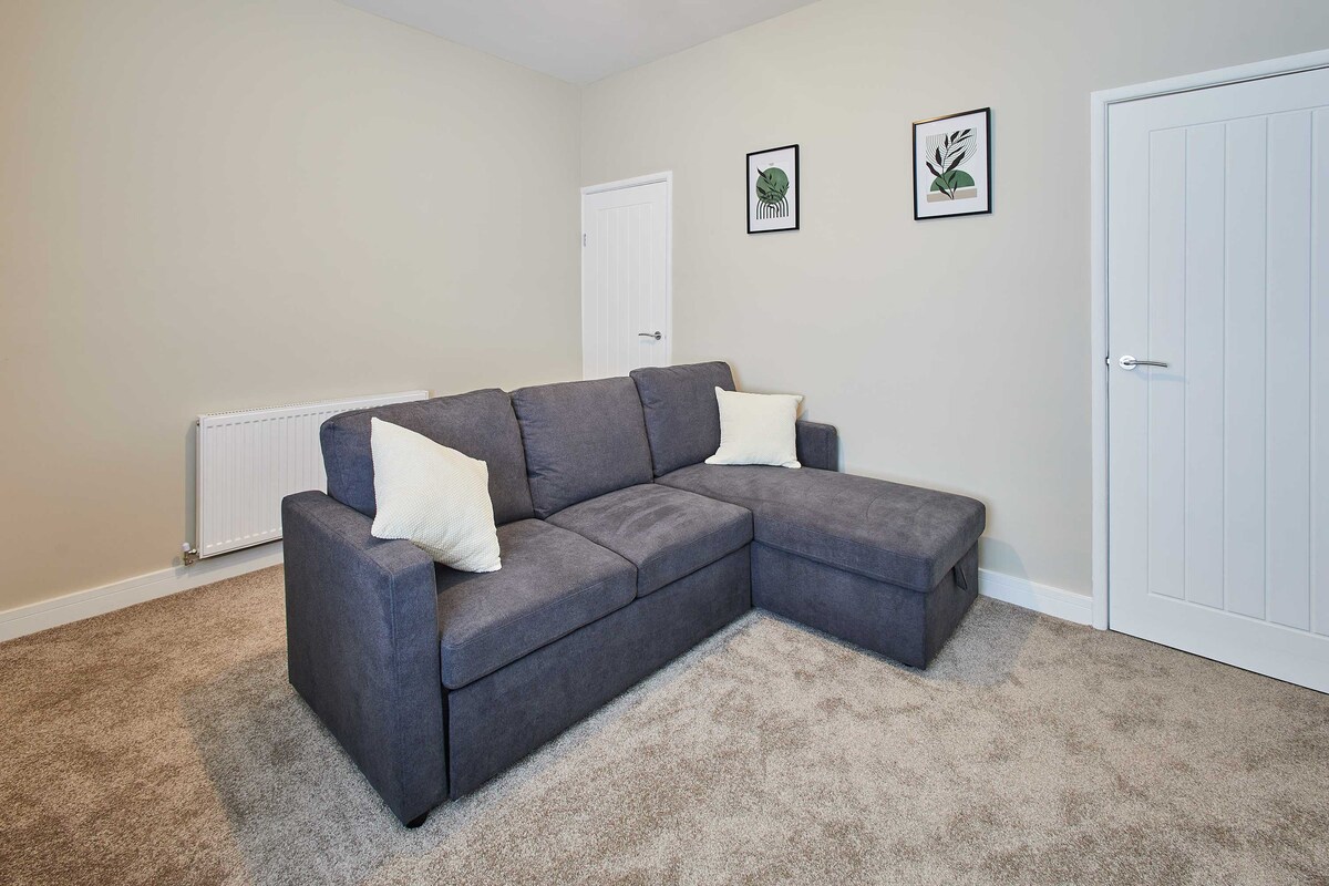 The living room features a comfortable corner sofa, a small desk space and a flat-screen TV. This is the ideal space for those looking to relax or those who need to log on and work whilst they are away.