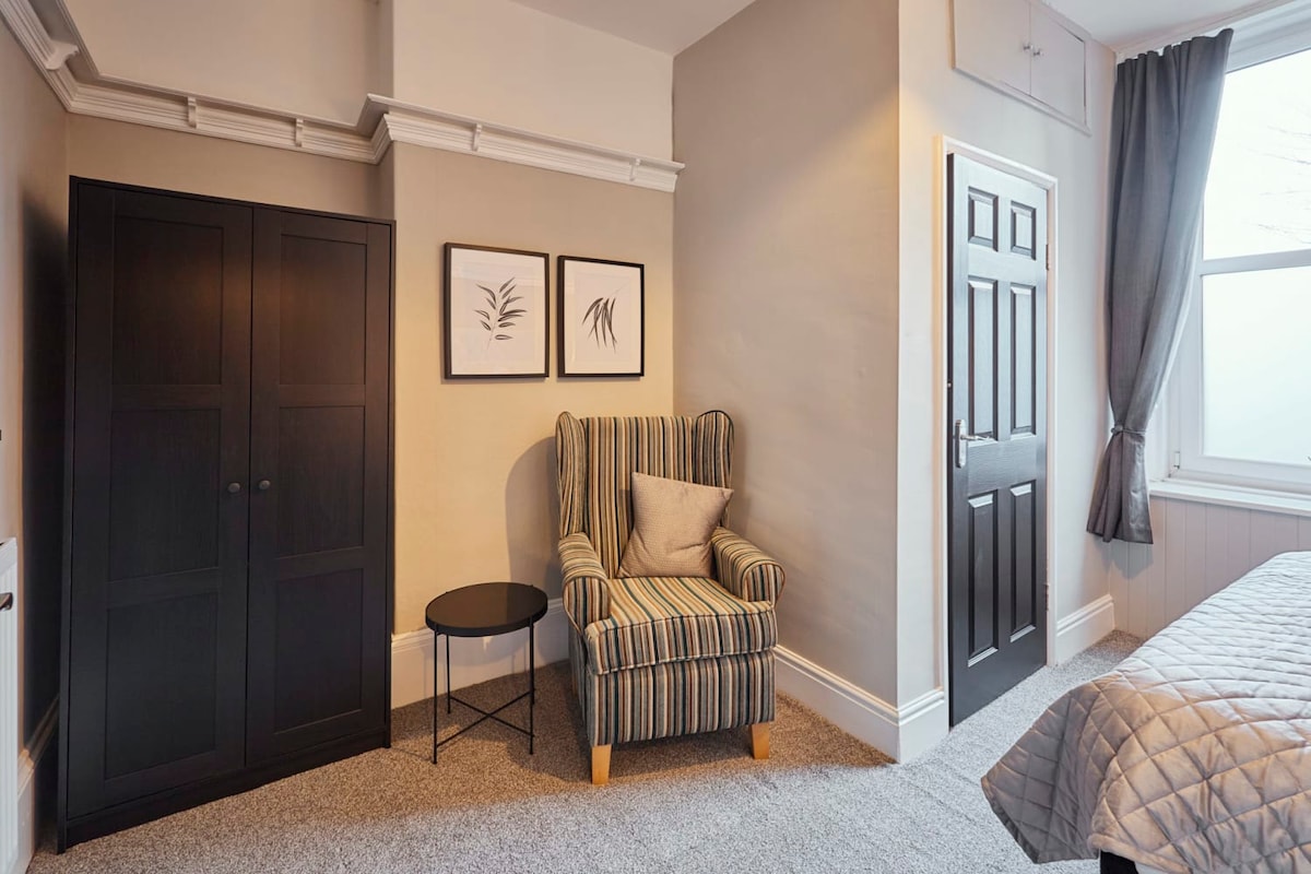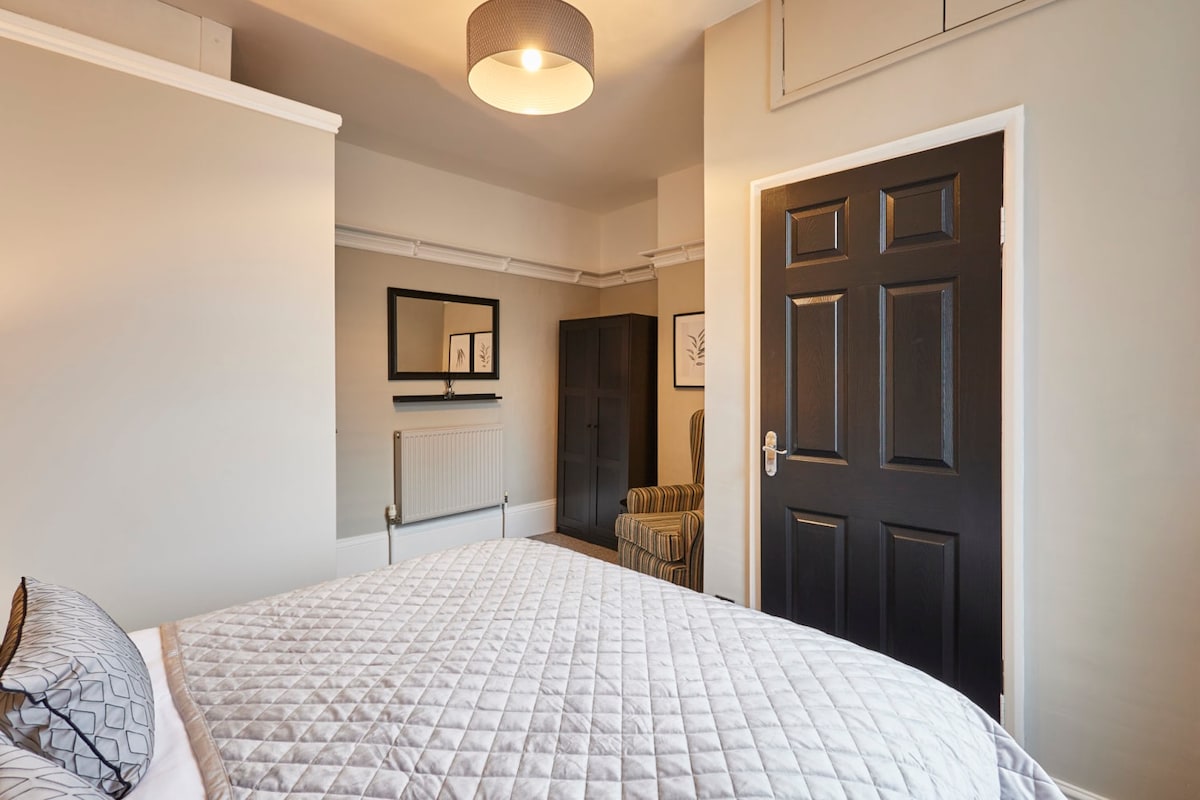 Continue along the apartment and you’ll find the bedroom. Sleeping up to two guests, the bedroom includes a king size bed along with a wardrobe and bedside drawers. The calm colour palette, black-out curtains and luxurious linens will aid a peaceful night sleep.