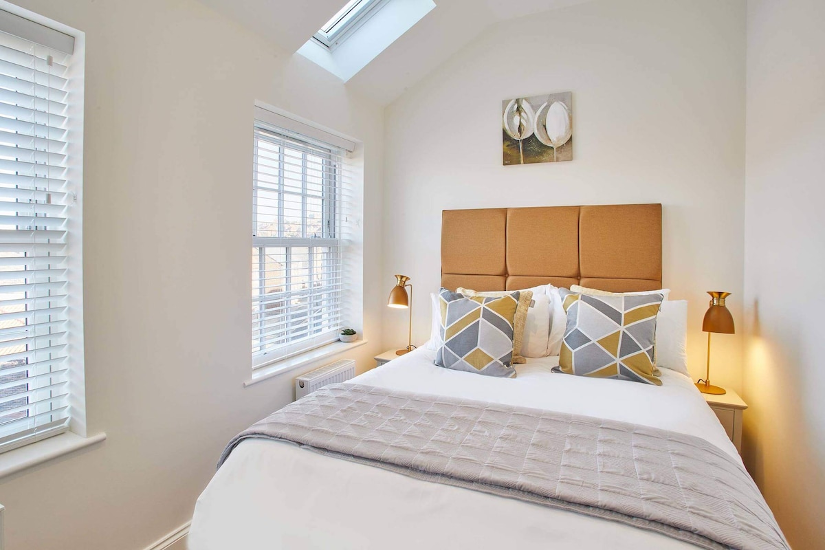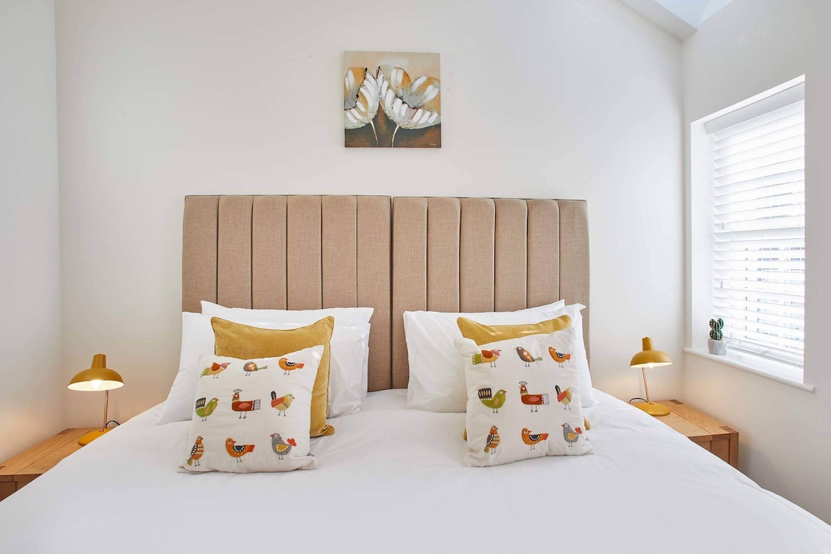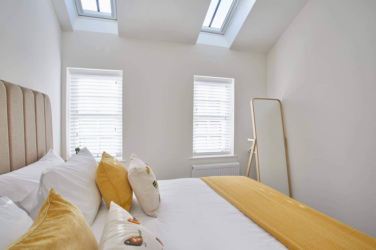 Upon entering the next bedroom, you’ll be welcomed into a light and tranquil space. Skylight windows arch over the bed so you can gaze at the stars from the comfort of the Super King Bed. This room also boasts an en suite with a large, walk-in shower.