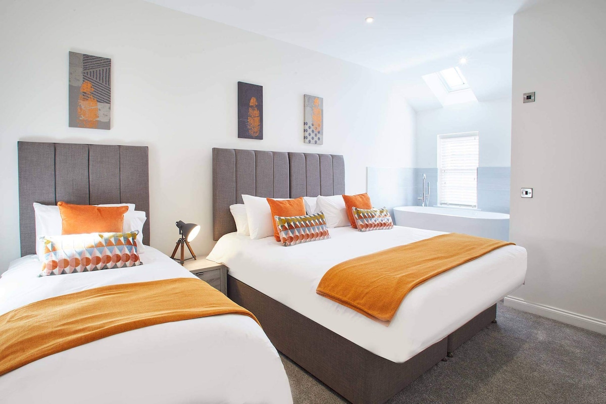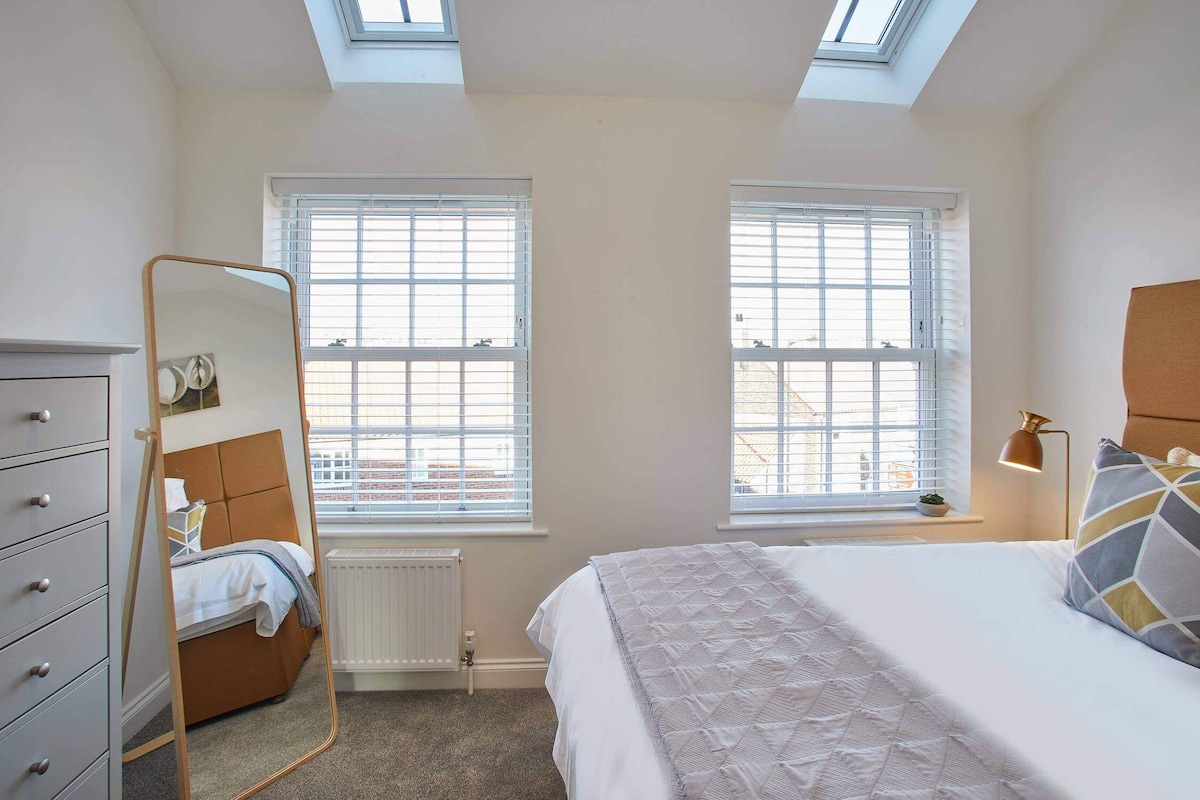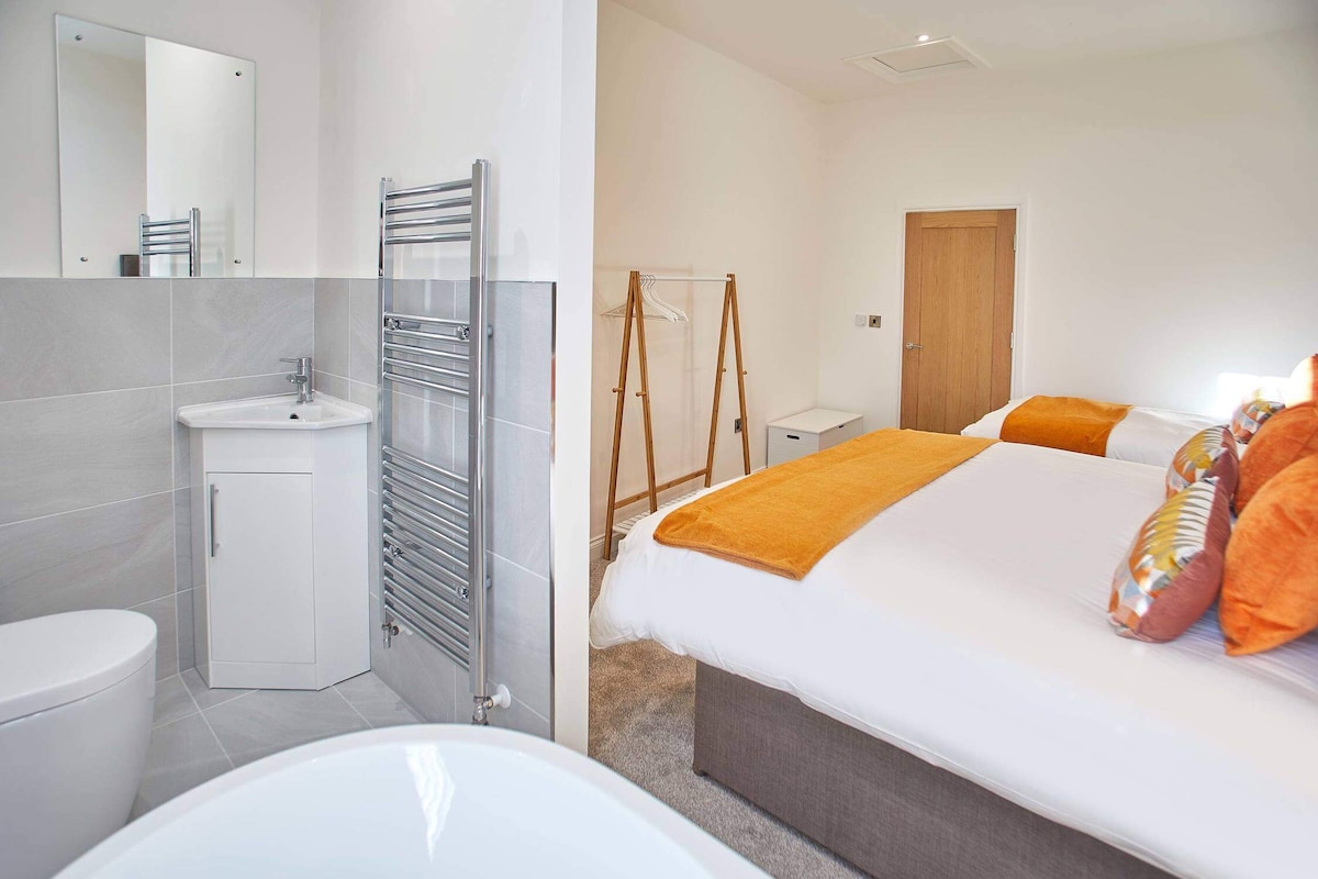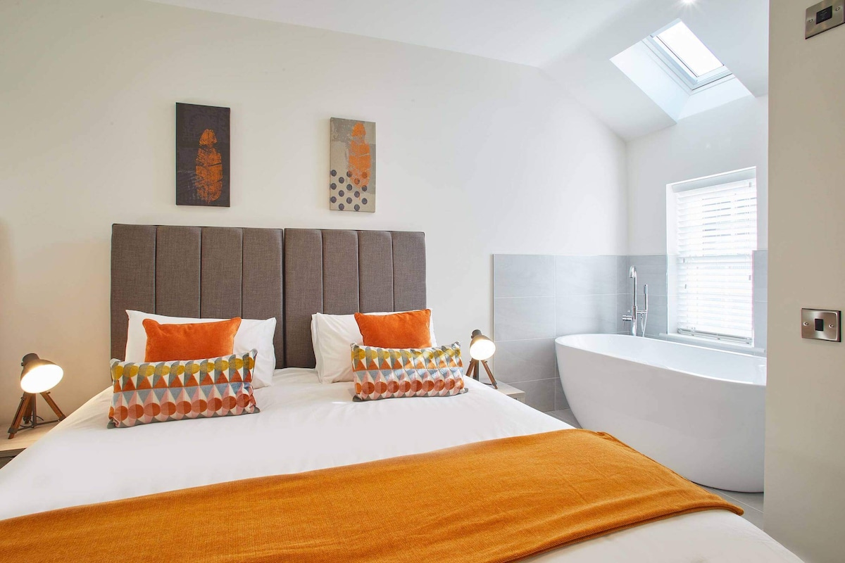 The main bedroom is large and bright with stylish interiors. It boasts a Super King bed as well as a single bed. It also has a striking free-standing bathtub in the corner of the room. Blocked by a partial wall, there is also a toilet and sink area. Ideal for families, this room is both luxurious and practical as the Super King bed can also be made up as two single beds if this is more suitable for your stay.
