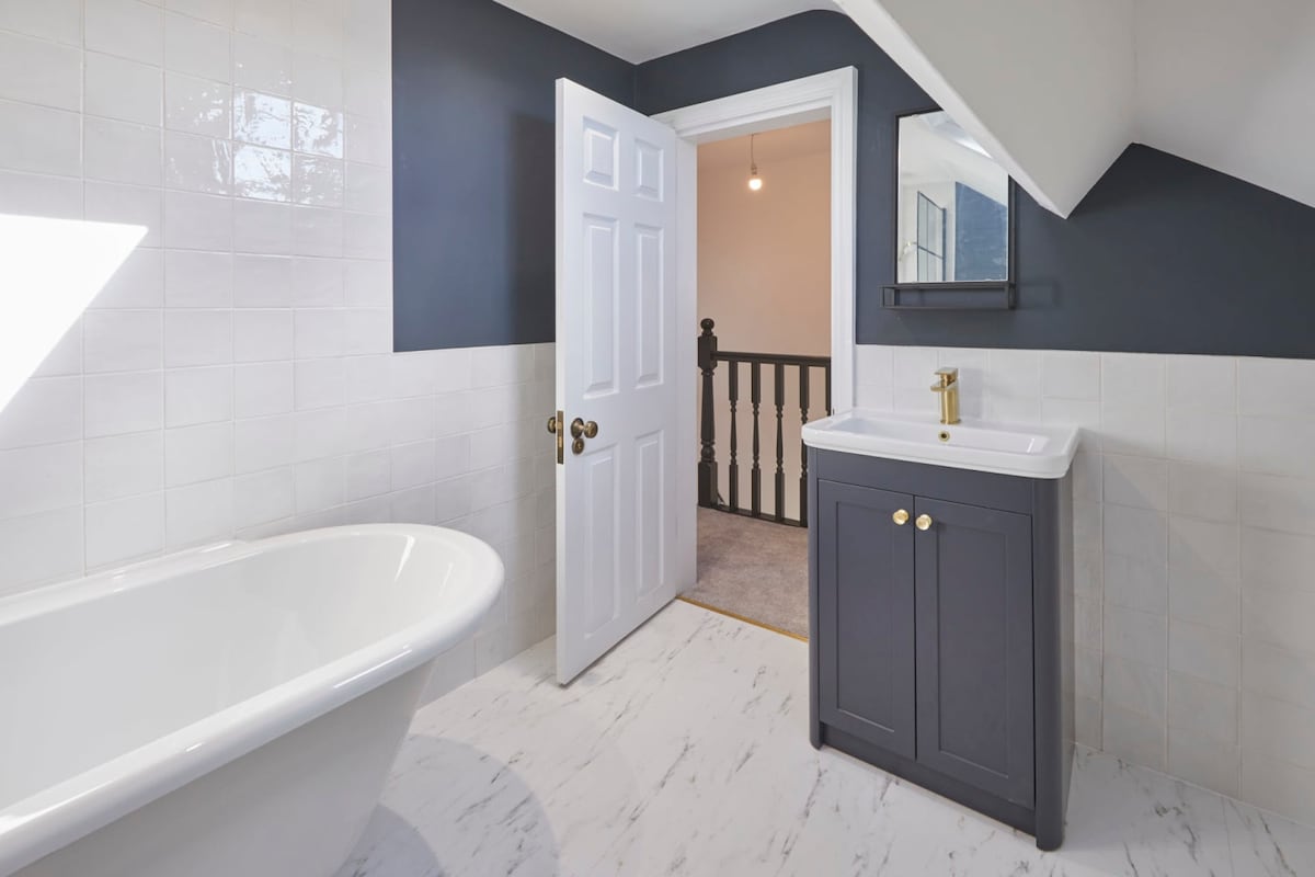 The final bedroom and bathroom can be found on the third floor. With sloped ceilings, both rooms have a cosy feel. The final bedroom boasts a double bed and the bathroom has a roll top bathtub with an overhead shower, WC and a basin.