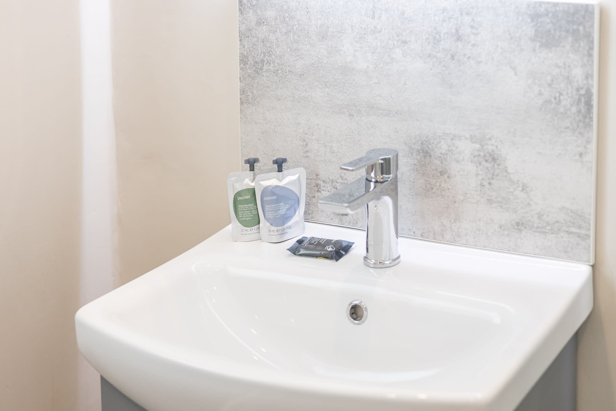 The bathroom features a walk-in shower, basin and a WC. Recently refurbished, it has a modern feel and silver finishings.