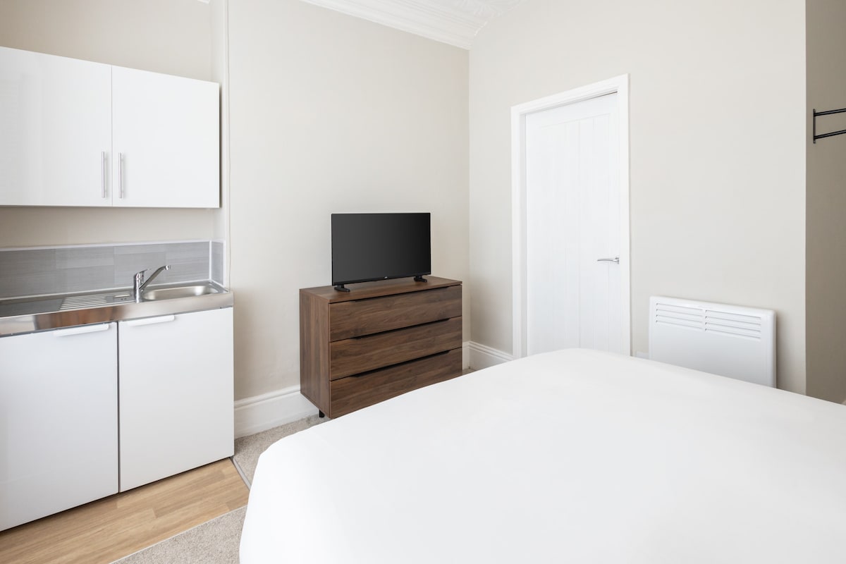 Clifton Studio 1 is the perfect place to rest your head if you’re looking to escape the hustle and bustle of everyday life or visiting Darlington for a business break. There is a sense of calm in the studio with its minimalistic décor and styling. It features a pale colour palette, a soft grey carpet, and warm tones of yellow and orange in the furnishings.The modern kitchenette includes a microwave, kettle, fridge, sink, dishes and cutlery.