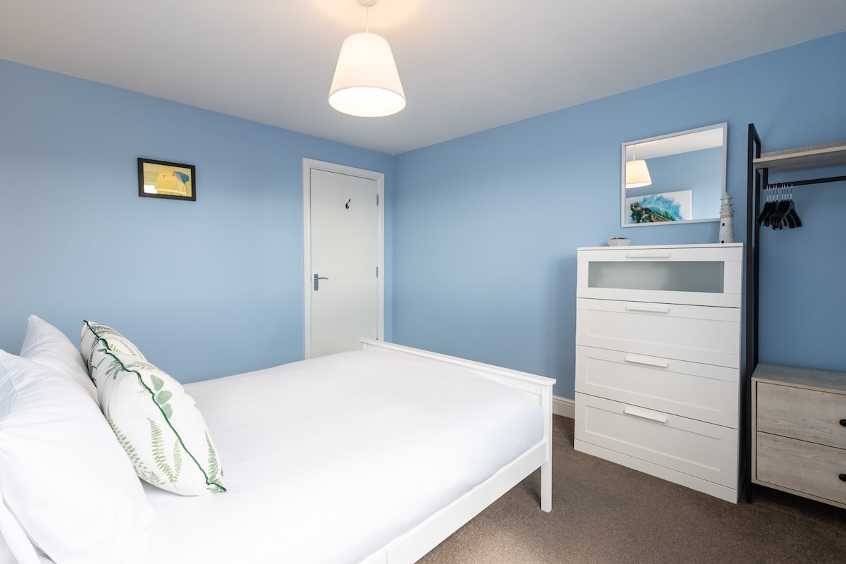 Next up is the bedroom. In here, you’ll find a relaxing and comforting space with a double bed. The light blue colour scheme creates a tranquil atmosphere. The room is complete with bedside tables, lamps, hanging space, and a chest of drawers for storage.