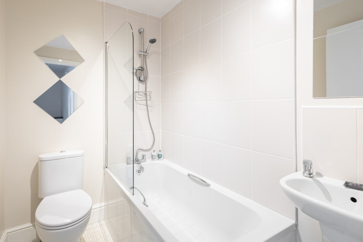 Modern and clean, the bathroom features a bathtub with an overhead shower, wash basin and WC.