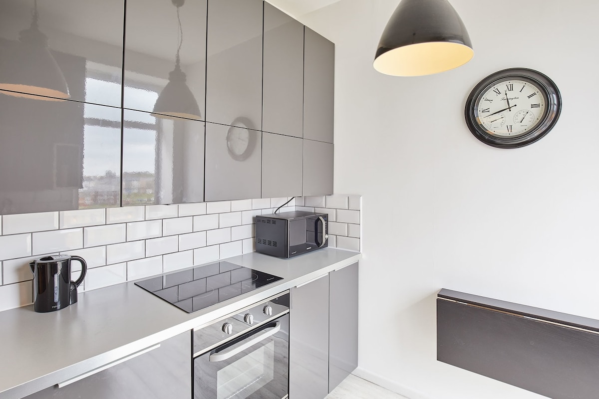 Just off from here is the grey-themed kitchen which creates a cosy feel and contrasts beautifully with the clean, white wall tiles. You’ll have everything you need for your stay as the kitchen is equipped with an oven, hob, microwave, toaster, kettle, fridge-freezer and dishwasher.