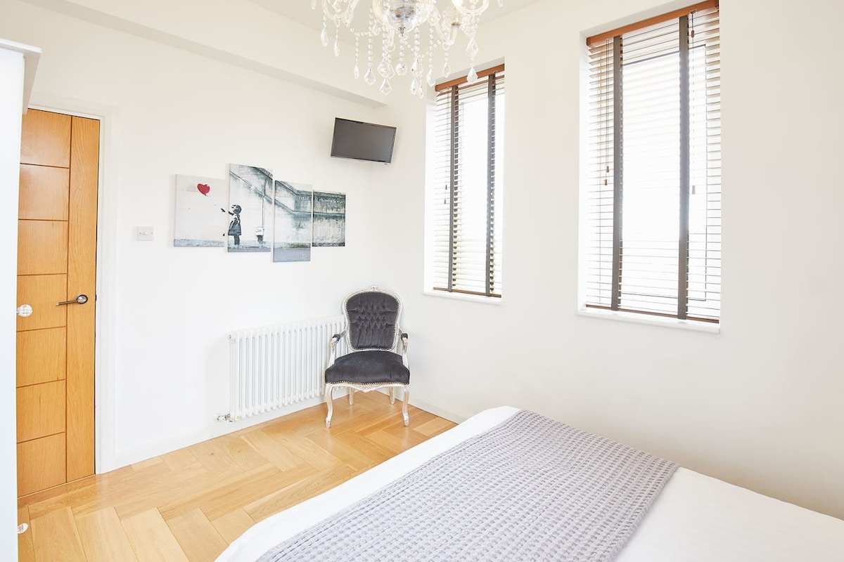 The master bedroom is a clean and bright space featuring a double bed and a crystal chandelier which hangs above the real oak flooring. The neutral colour scheme creates a light and calming environment. A wall-mounted flat screen TV, a dressing table and bedside tables complete the room and add even more glamour.