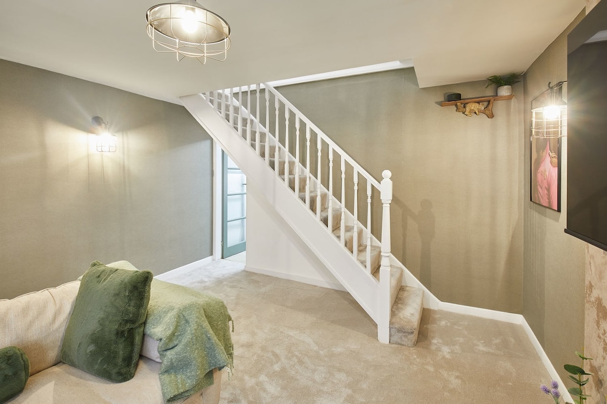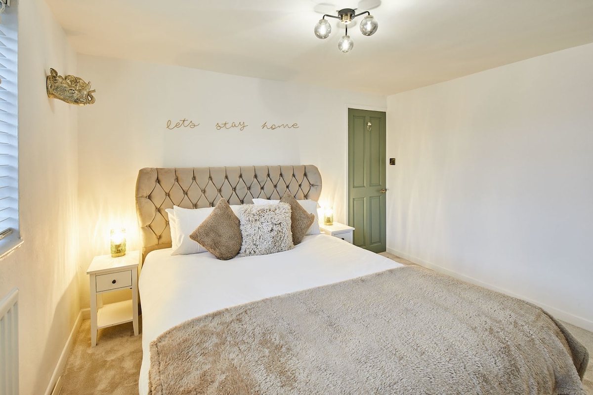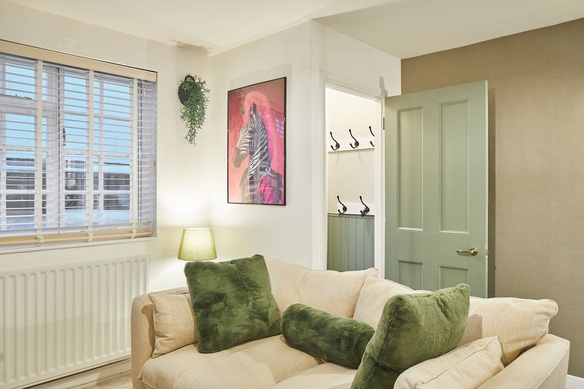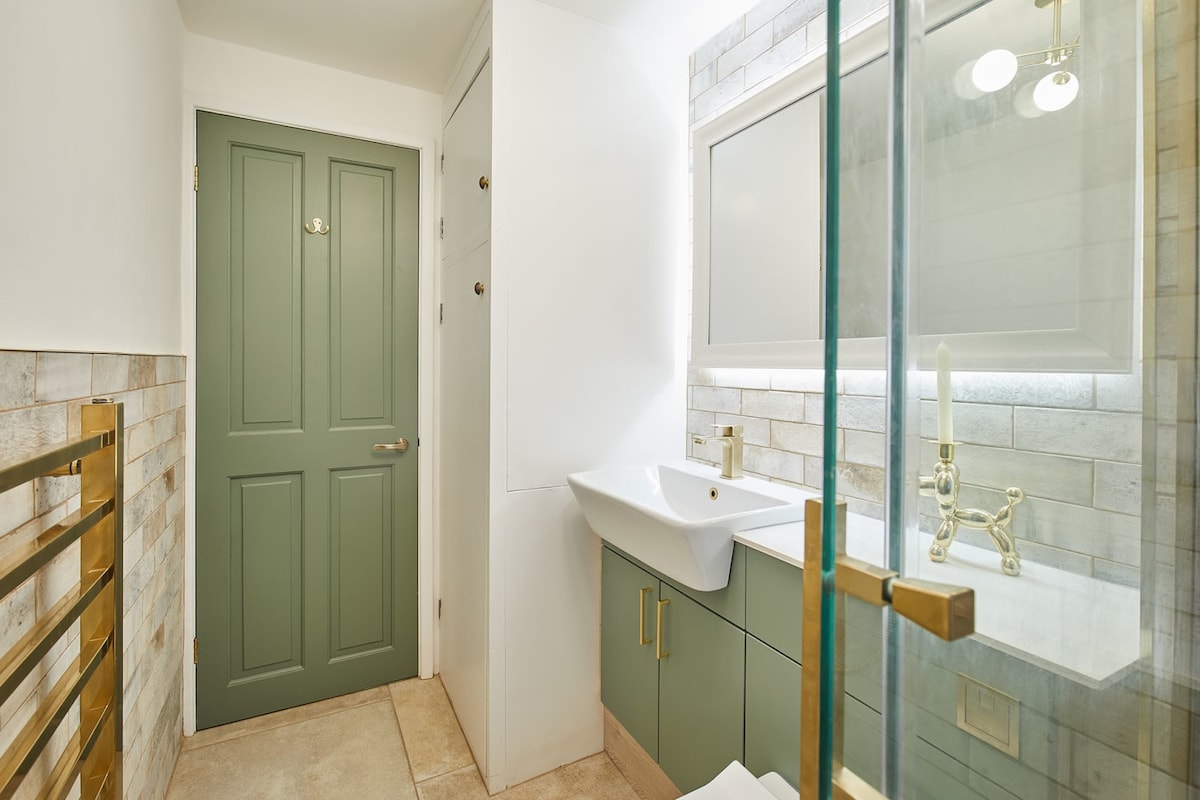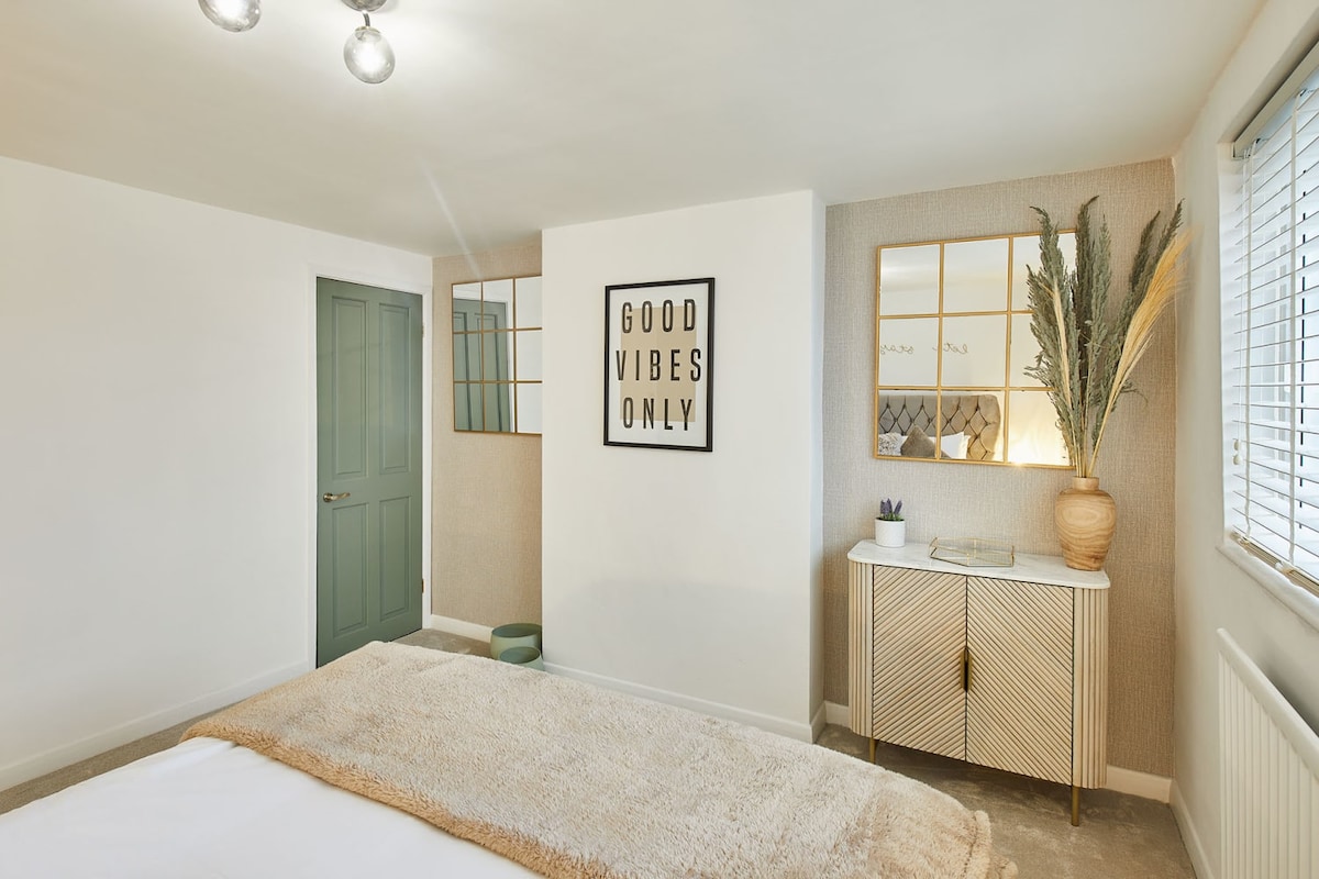 The living room at Bentley Wynd is packed with style. Light floods in from the front window which amplifies the feeling of spaciousness. Rich colours and textures are added through the furniture and soft furnishings. In the living area, the soft cream sofa brings warmth to the space. Perfect for relaxing, you can lay back on the sofa and get lost in a good book. In the winter months, turn on the fire and enjoy a cosy night in front of the TV.Head to the kitchen and you’ll find a modern and unique space. With pistachio green cabinets and white worktops, there is an undeniable cool look. Both practical and stylish, the kitchen is fully equipped for self-catering stays. There is an oven, hob, microwave, toaster, kettle and fridge as well as a dishwasher, washing machine and dryer.
