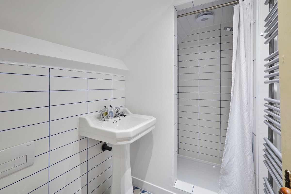 In the second floor bathroom, there is a walk-in shower, basin and WC.
