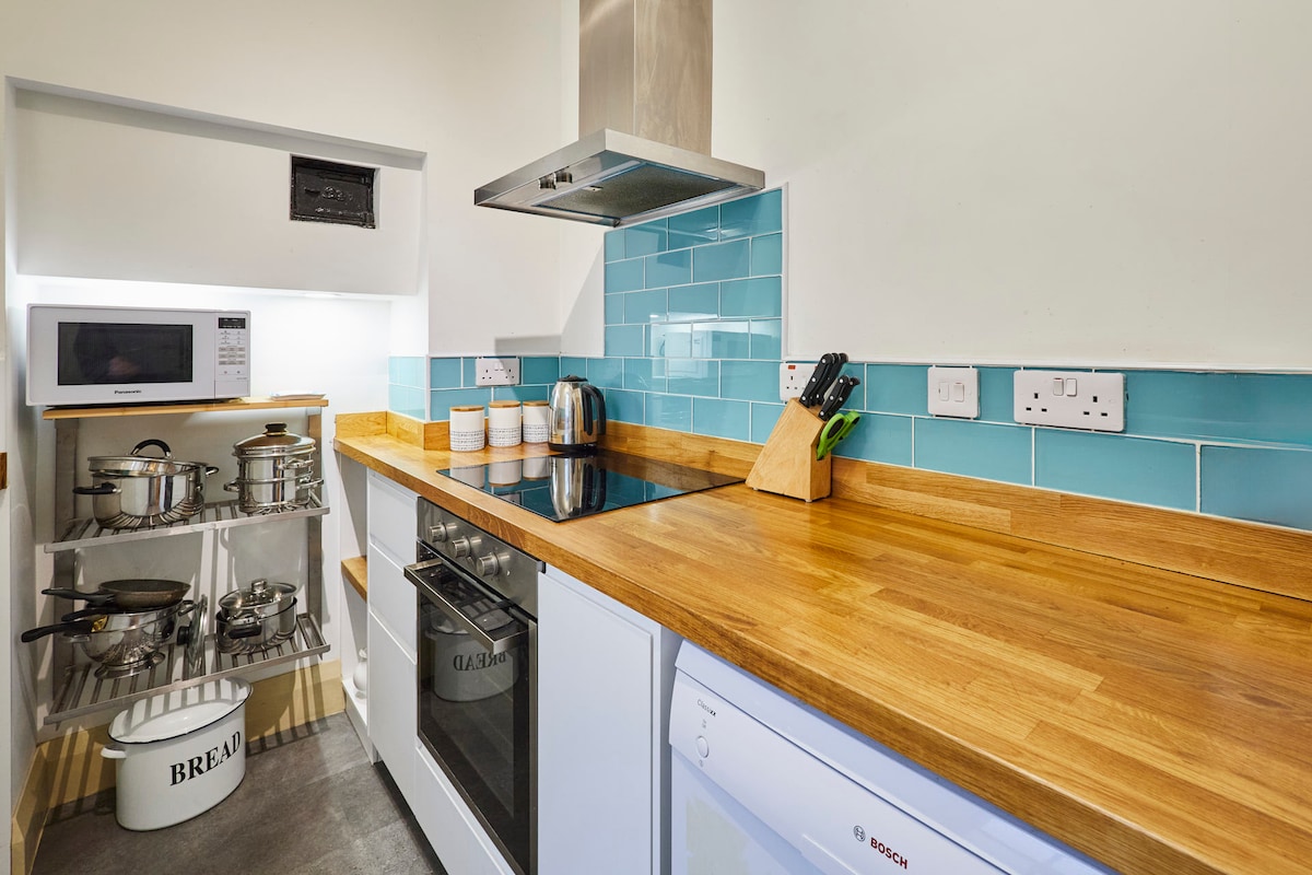 The galley kitchen has been given a modern revamp and is fully equipped with appliances and cookware so you can prepare meals easily during your stay.