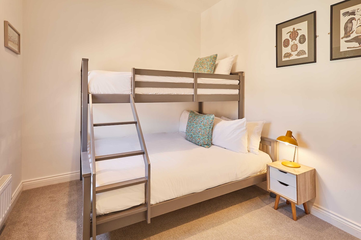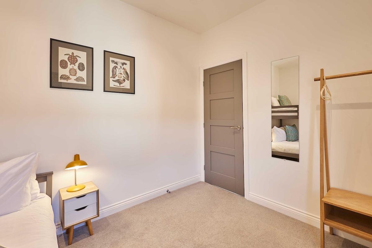 Downstairs you’ll find two cosy bedrooms. The master bedroom is a relaxing space with crisp white walls and a bunk bed (double on bottom bunk, and single on top bunk). You’ll enjoy your sleep as the comfy mattress is complete with premium linens and bedding. The second bedroom is ideal for children and teenagers. The twin beds feature quirky copper metal frames and there is a wooden rack for clothing.