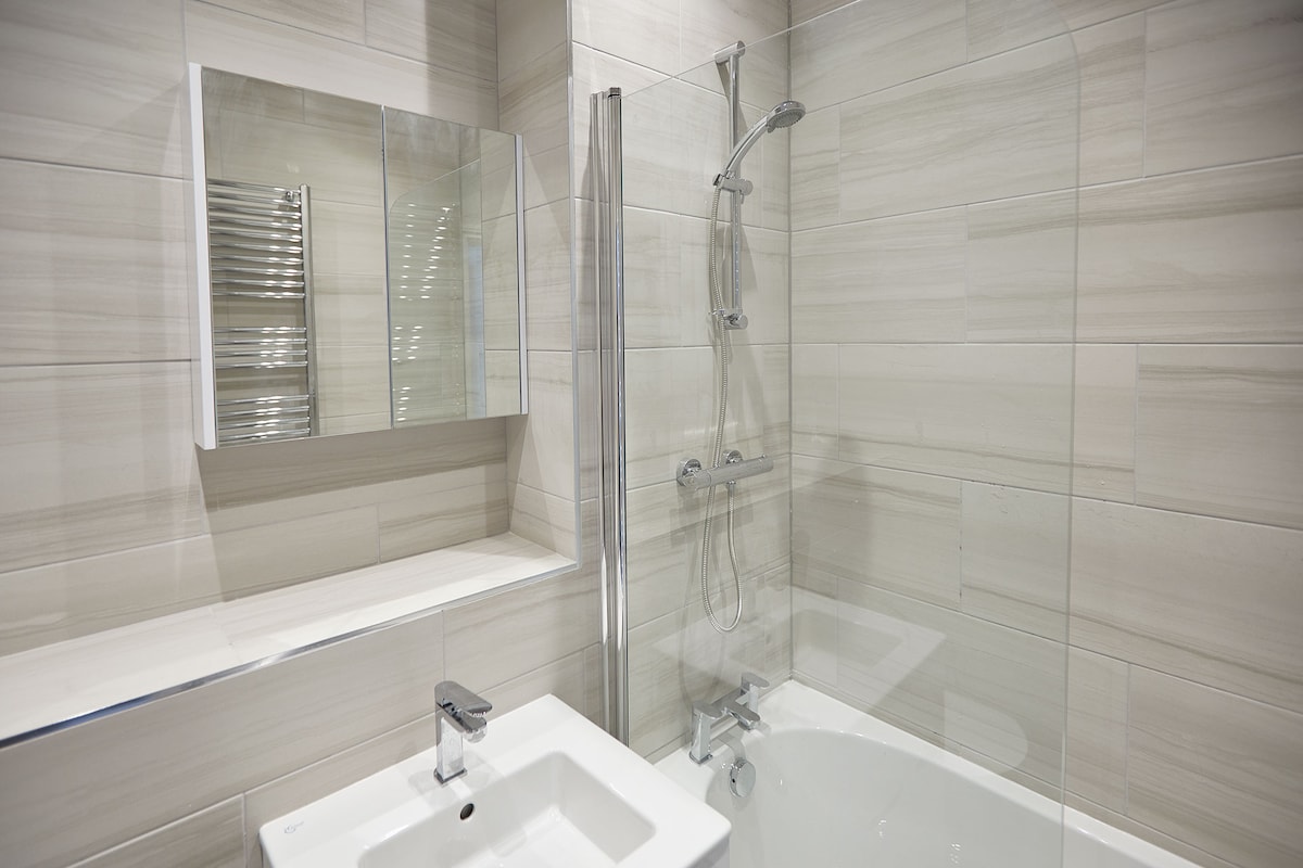 As expected, the bathroom is a clean and modern space. With large tiles and chrome throughout, it is both stylish and sophisticated. The bathroom includes a bath with an overhead shower, WC and basin.