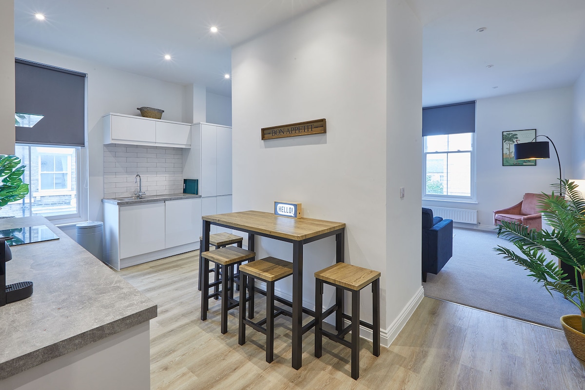 In the kitchen, there is also a cosy dining area with four matching stools. With the same cool style as the rest of the apartment, it fits in perfectly whilst also providing a great place to socialise with the rest of your party.