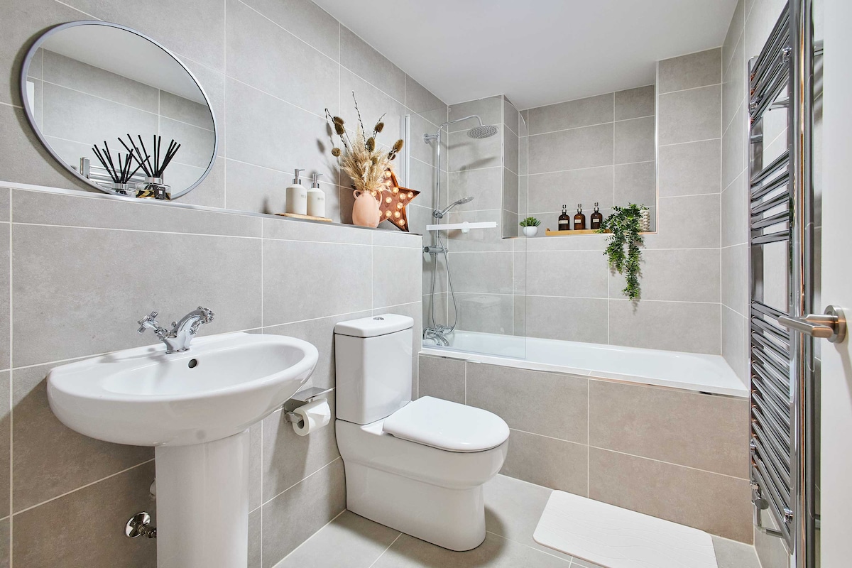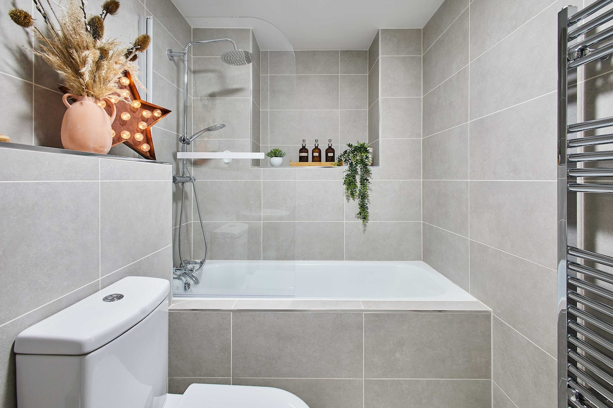 The sparkling clean ensuite bathroom is a delightful space. It boasts a bath with a handheld and rain shower, and a WC.