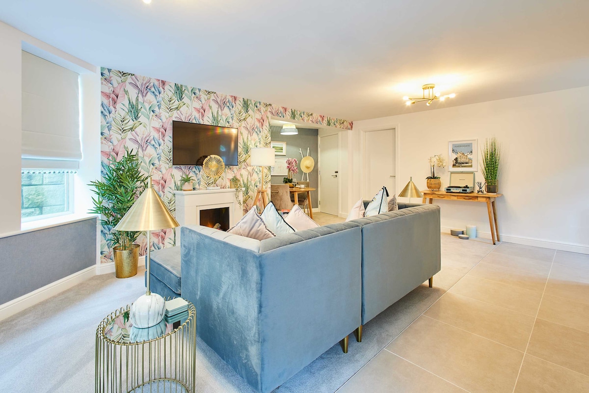 The apartment entrance leads to the spacious open-plan living, dining, and kitchen area. Featuring a large chaise lounge sofa, a sleek wall-mounted Smart TV, and an indoor fireplace, it’s the perfect definition of a cosy getaway.