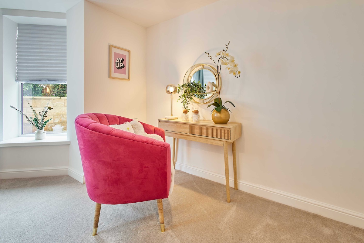 The bedroom is another spacious area with a king-size bed, a vanity space with a lovely accent chair and a mirror.