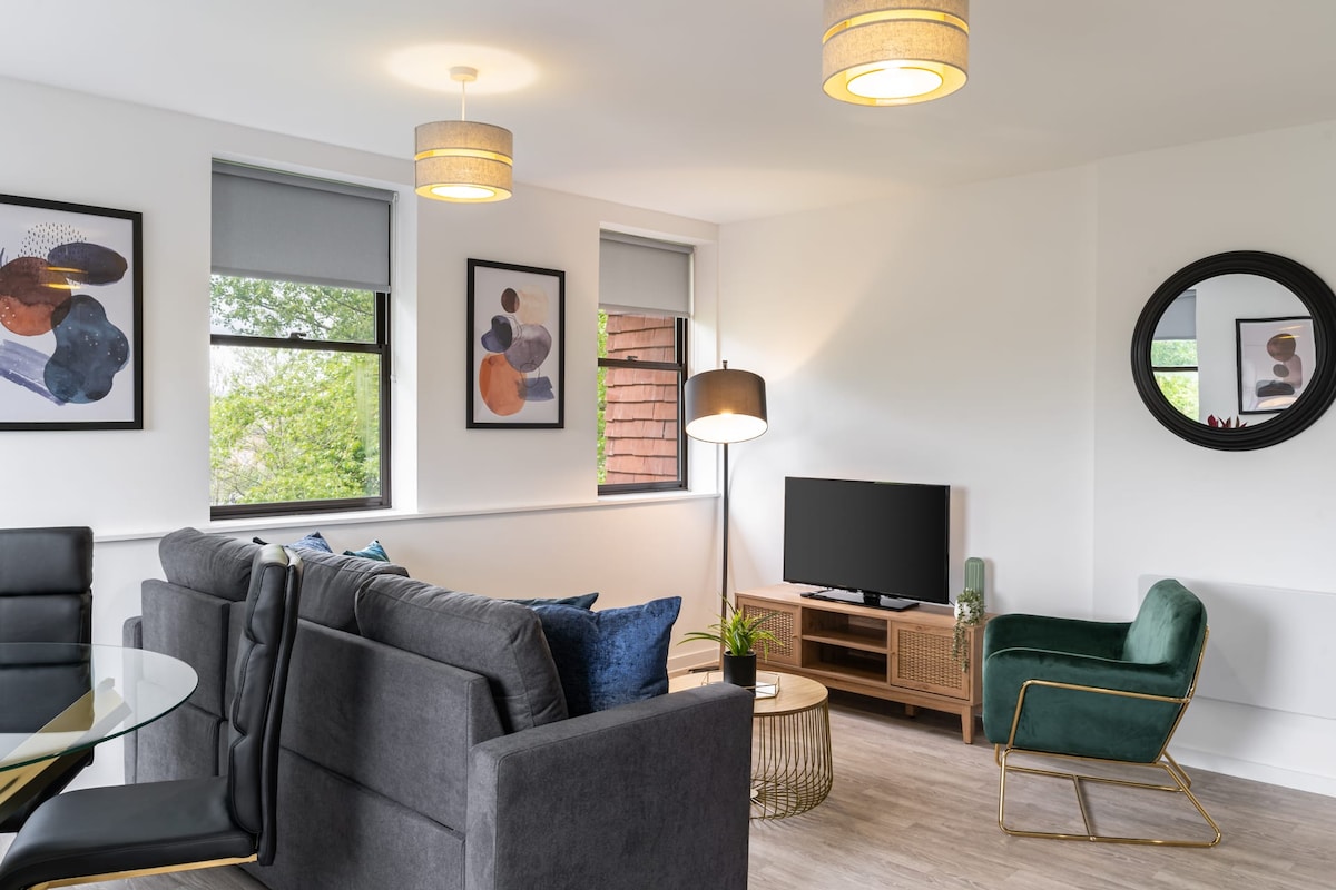 52 Waterside Place is located on the third floor of recently built apartment block in Taunton. Access is via lift or a set of stairs, so the apartment is suitable for everyone. Once inside the apartment, you’ll find an open plan living, kitchen and dining room, bathroom and bedroom.The living space is a comfortable and homely room with a large velvet sofa, a stylish coffee table, and a pine green armchair for you to relax in. The television is a generous size and has a number of Freeview channels, along with access to Netflix and other apps so you can log in to your accounts.