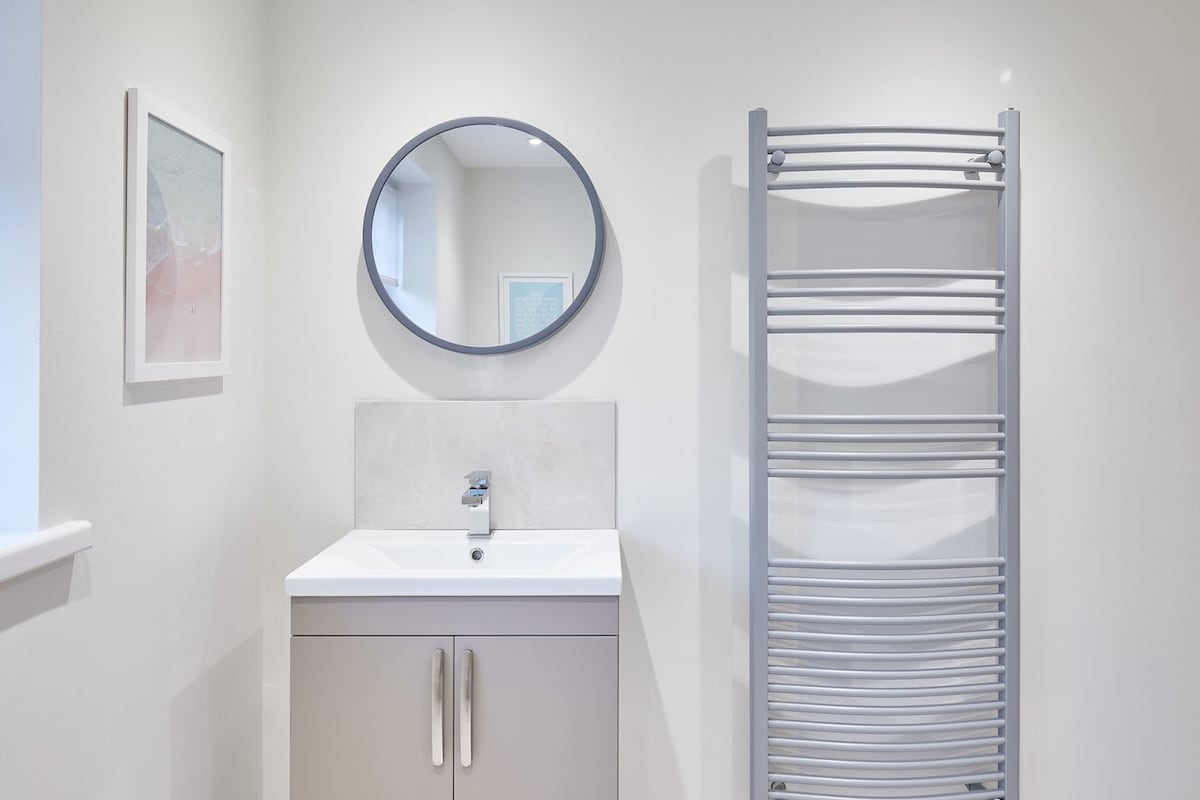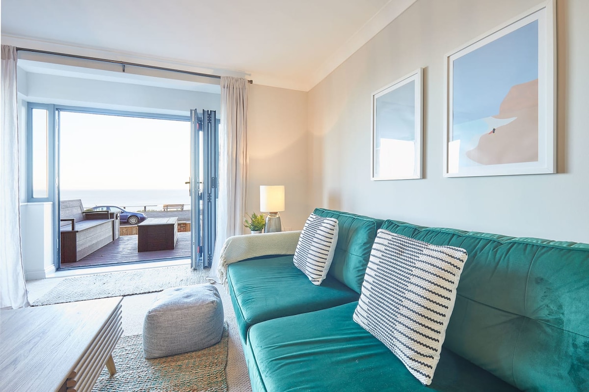 ‘Salty’ Seaview has a stylish and sophisticated living room. This bright and colourful space boasts two velvet sofas, a comfy armchair, as well as a flat-screen TV. Guests will also have direct access out onto the outdoor patio area which has ample seating for all of your friends and family to take in the fresh sea air and look all the way out to the horizon. With lighting as well, guests can enjoy themselves outside into the night.To the rear of the living area is where you’ll find the stunning kitchen that ‘Salty’ Seaview has to offer. With modern appliances, this space is fully equipped with everything you need to make the most of your self-catering stay in North Yorkshire. There is also a wooden dining table with matching chairs and a bench sharing the kitchen space.