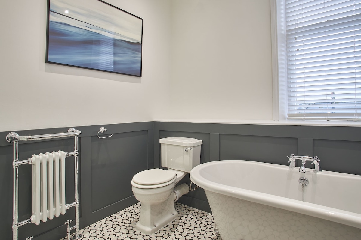 The family bathroom features patterned floor tiles and navy panelling which gives a real vintage feel. Enjoy a relaxing soak in the freestanding bathtub or make use of the large walk in shower. The space is complete with a WC and Victorian style basin.