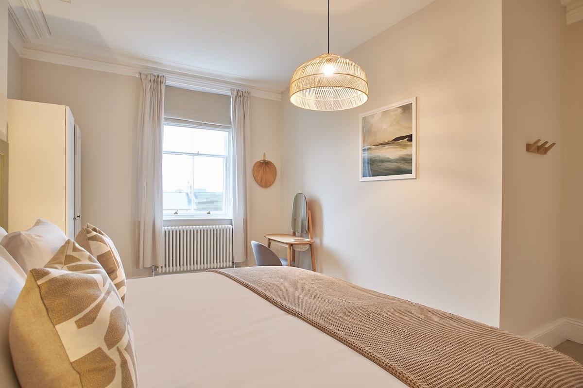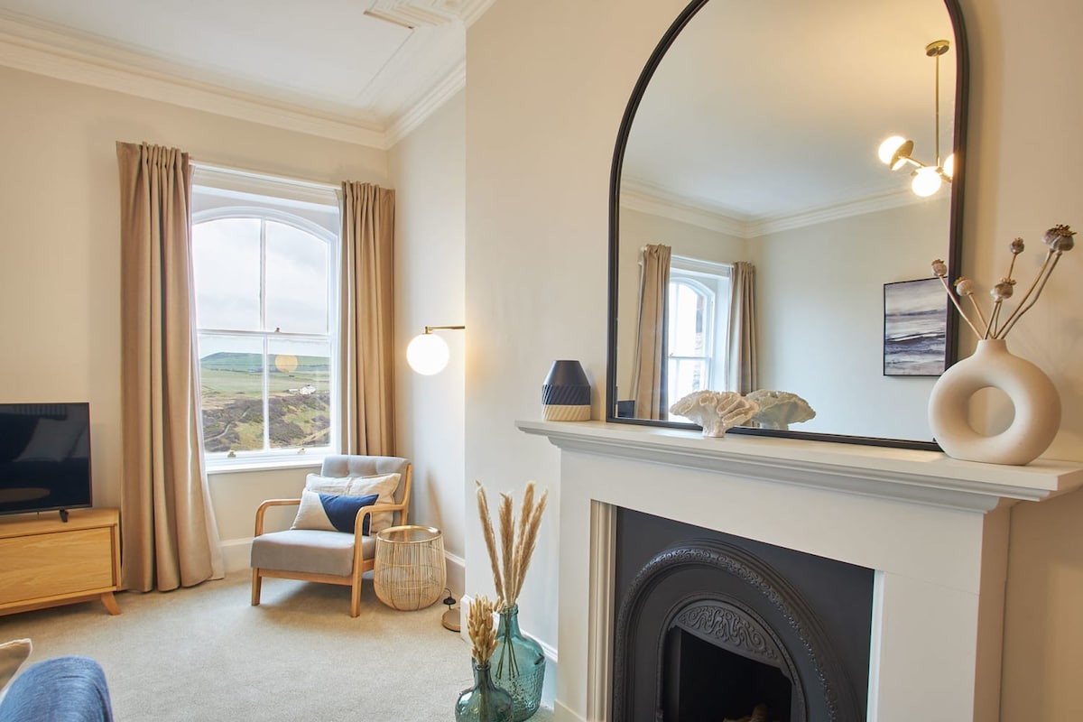 Short walk from the train station. The property faces the sea through one of the lounge windows and the adjacent window looks over the moorland. The view of the sea from the front bedroom is beautiful. The apartment is immaculate, the bathroom was pristine, the kitchen is extremely well equipped and modern. High ceilings make it feel even more spacious. I had to contact the host a couple of times for advice, the response was immediate. Just a point to note there are 60 stairs up to the apartment, but even my 88 year old mother was able to manage that. Our stay was lovely and we will definitely be back.