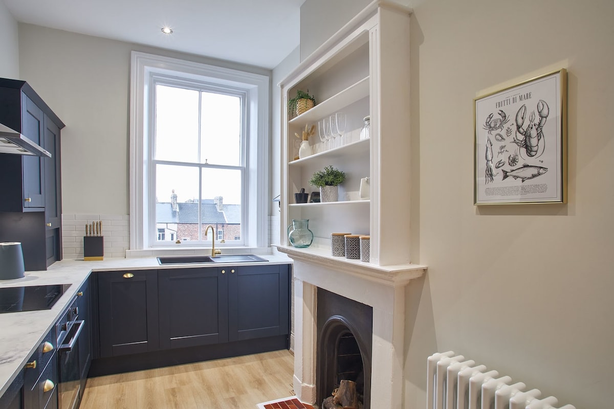 Beautifully decorated throughout, Huntcliff View Apartment is a stunning holiday apartment which has been recently renovated to the highest standard. Based within a listed building, you can expect plenty of character and charm. With a luxury yet minimalist style, the apartment features splashes of jewel tones and textures like velvet and rattan.The apartment benefits from a large living room, kitchen and dining area. Ideal for spending time with your loved ones, you can snuggle up on the blue chaise lounge style sofa. Whether you’d prefer to watch the flat screen TV or take in the incredible views of the coastline, this is certainly the perfect place to unwind.