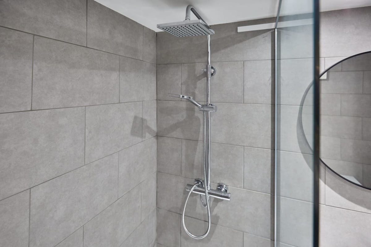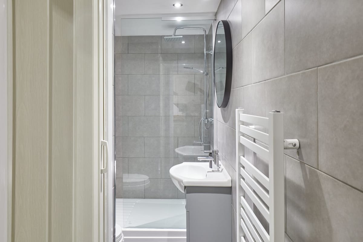 The family bathroom is located just off the kitchen. Ultra modern and clean, this space features a walk in shower, WC and basin.
