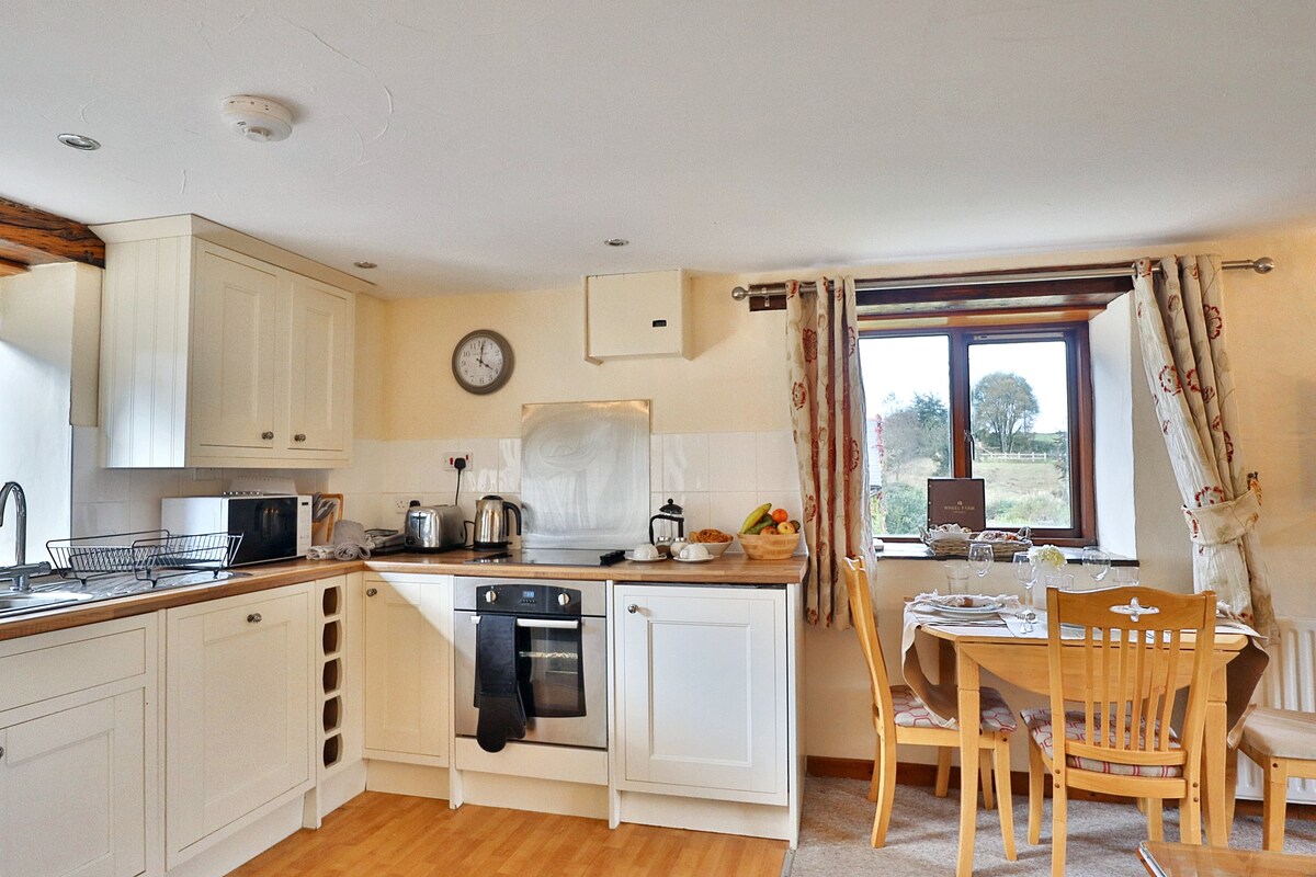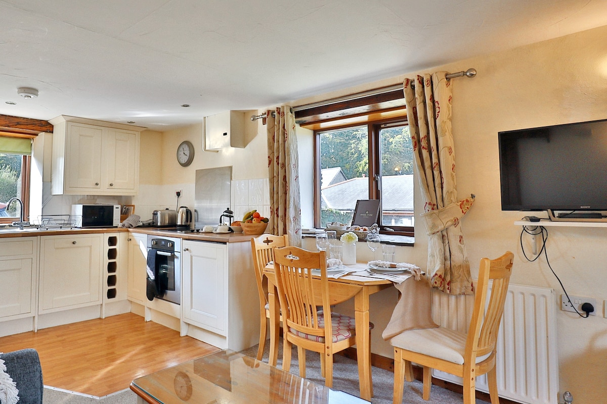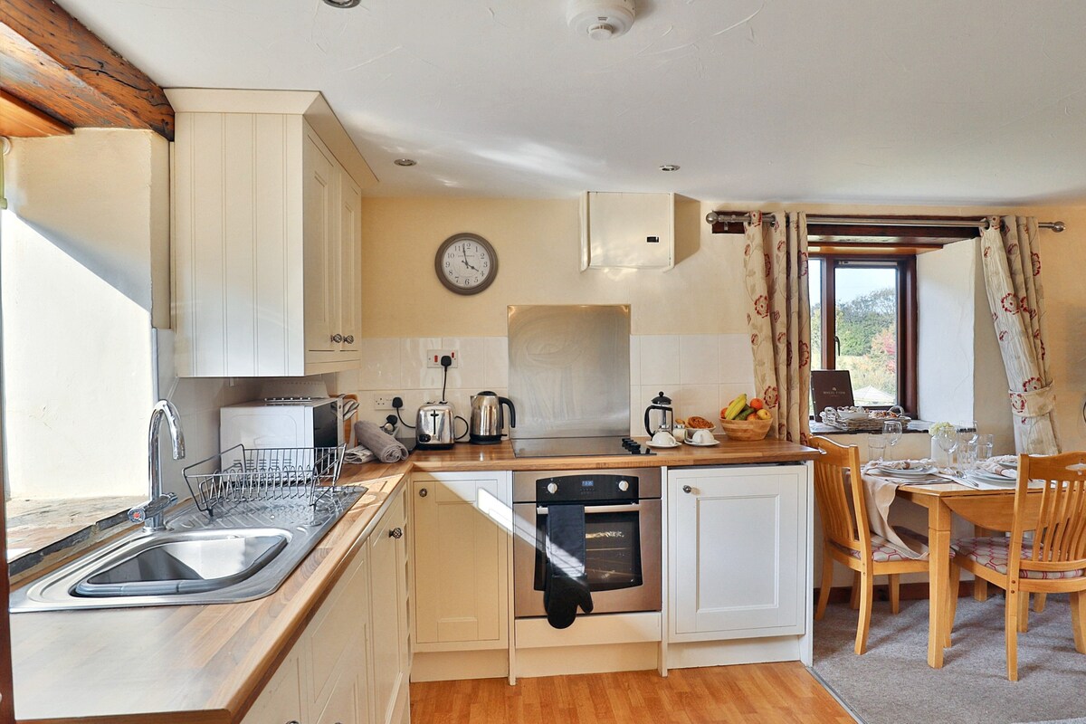 Kitchen Area/Living Area -The living spaces comprise of a well equipped kitchen, dining area with seating for four, a cosy living room with two sofas to enjoy watching the warm log burning fire. There is also a television in the living room, perfect for winding down in the evening after a busy day of exploring. The kitchen has all of the essential items needed to enjoy your stay! Included is an oven, toaster, microwave…