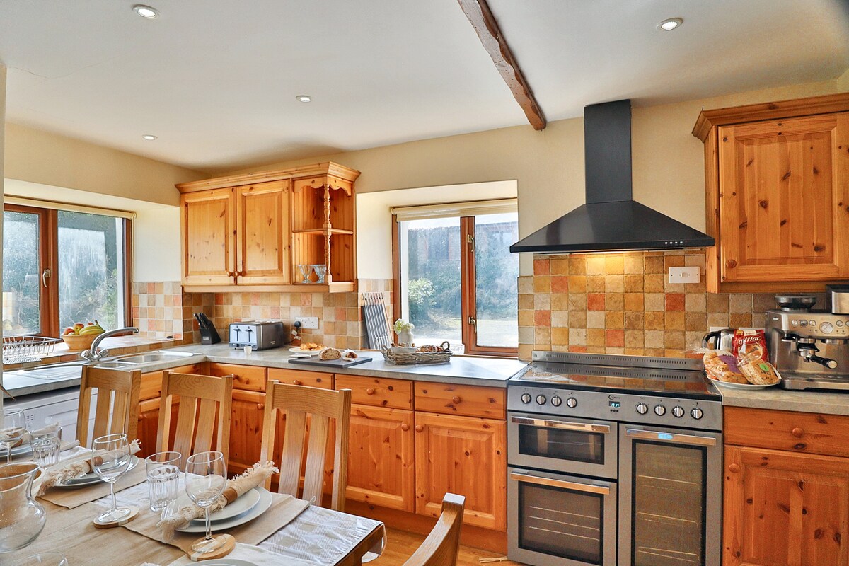 Kitchen Area/Living Area -The living spaces comprise of a well equipped kitchen, dining area with seating for up to people, a spacious living room with plenty of seating allows you to relax with friends. There is also a television in the living room, perfect for winding down in the evening after a busy day of exploring. The spacious living room provides plenty of room for games nights and family fun! The kitchen has all of the essential items needed to enjoy your stay! Included is an oven, fridge freezer, toaster, microwave, washing machine & more… The property also has a slow cooker.