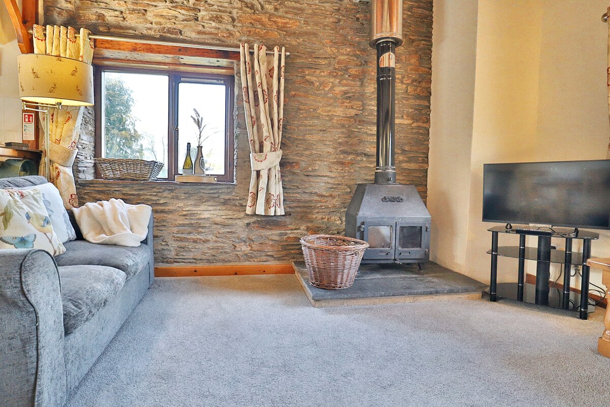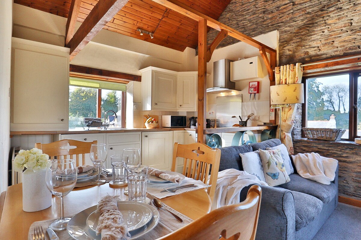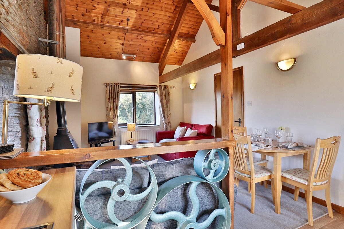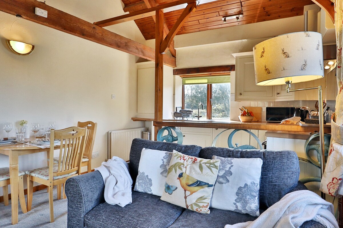 Kitchen/Living Area –The living spaces comprise of a well equipped kitchen, dining area with seating for four, a cosy living room with two sofas to enjoy watching the warm log burning fire. The kitchen has all of the essential items needed to enjoy your stay! Included is an oven, toaster, microwave…