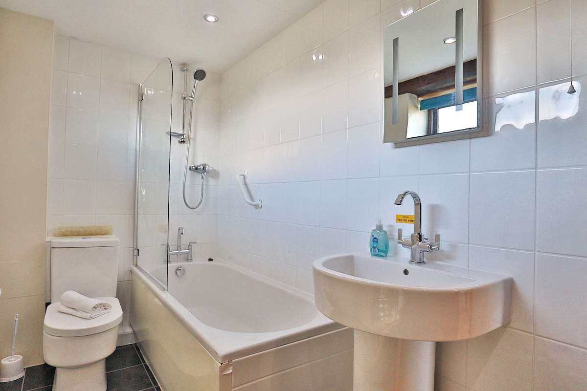 The bathroom consists of a bath with an overhead shower, toilet and basin.