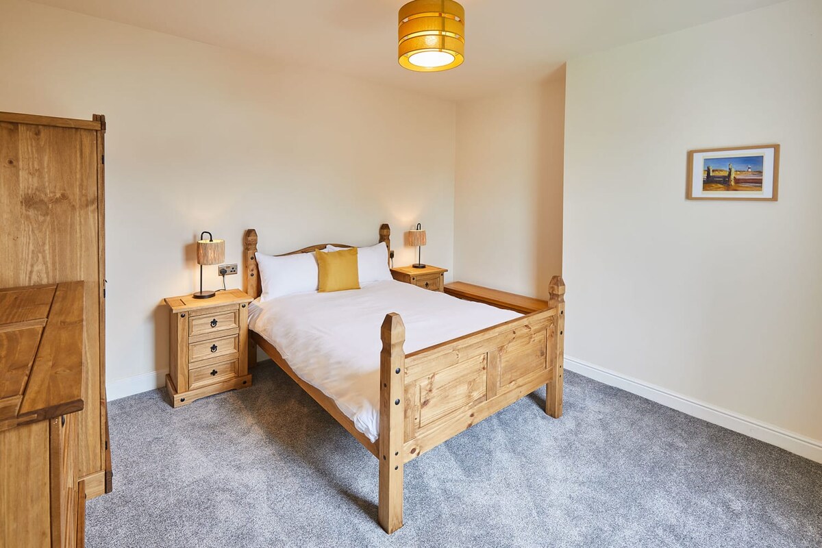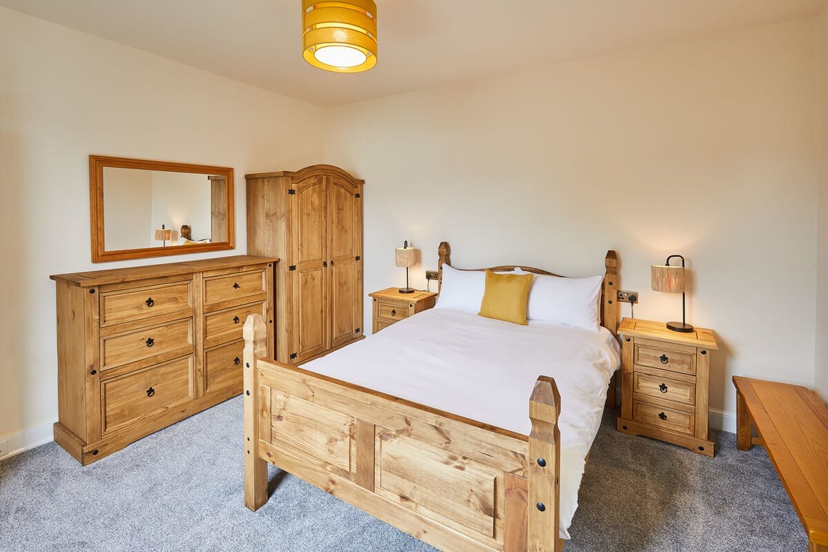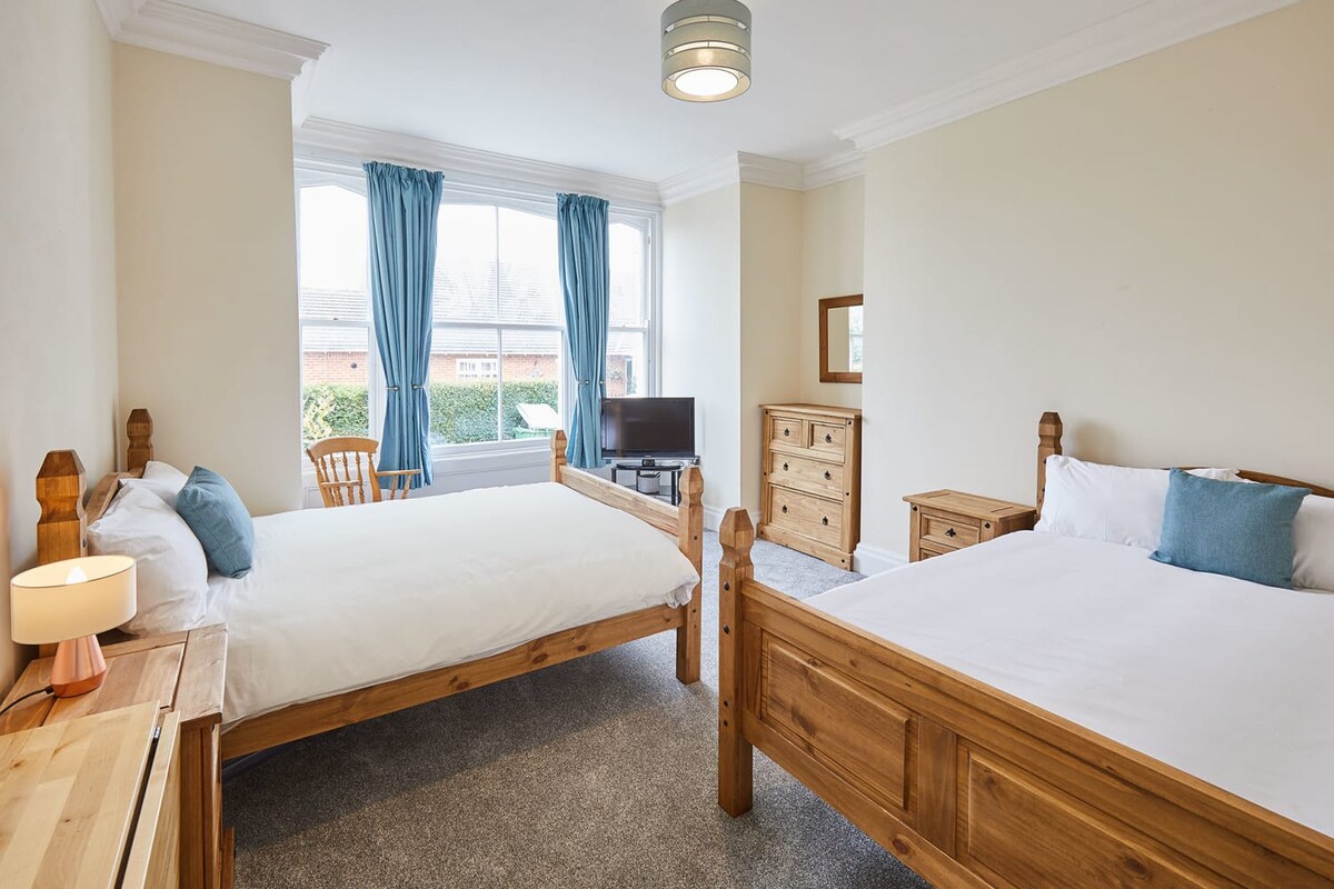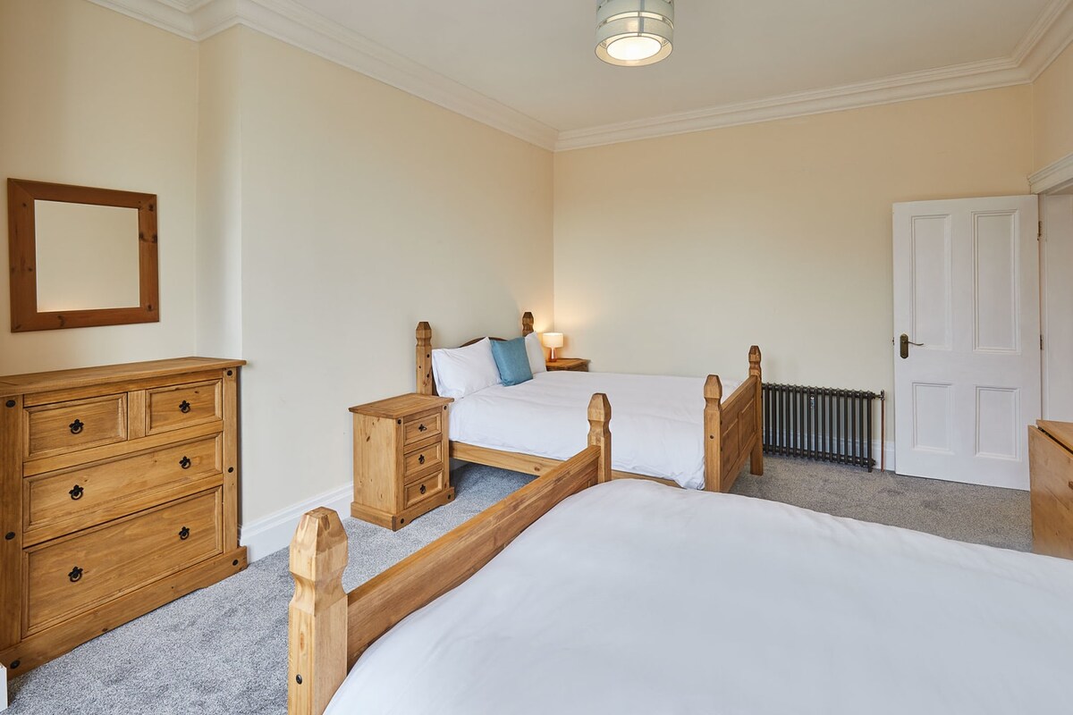 The open-plan living, kitchen and dining room at The Old Vicarage is a great space for socialising with your loved ones. It is well-fitted with two spacious and comfy sofas, a wall-mounted flat-screen TV, a dining table in the window and a fully-equipped kitchen with modern appliances. With its large bay window, the room has natural light flooding the room.The first bedroom is a relaxing space with a double bed, a neutral colour scheme, and plenty of storage for your belongings. The second bedroom boasts a king-size bed and offers excellent storage space too. The third bedroom is a twin formed with two double beds and a flat-screen TV.