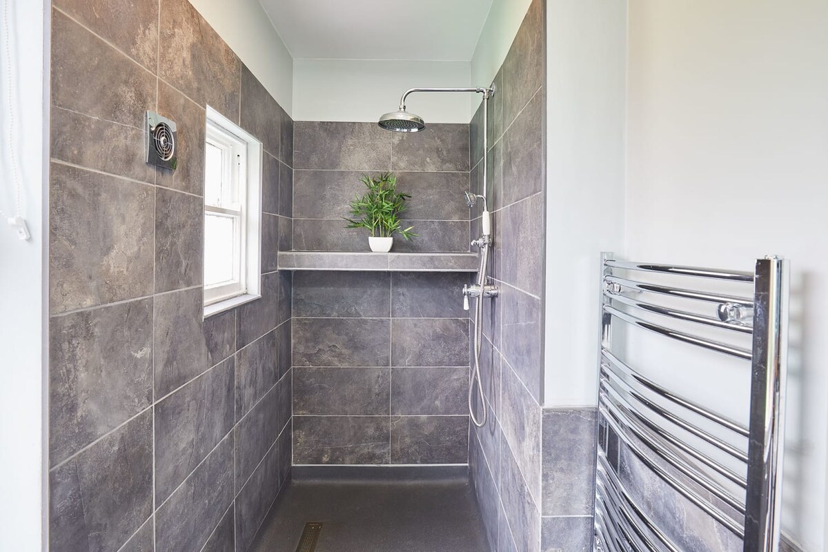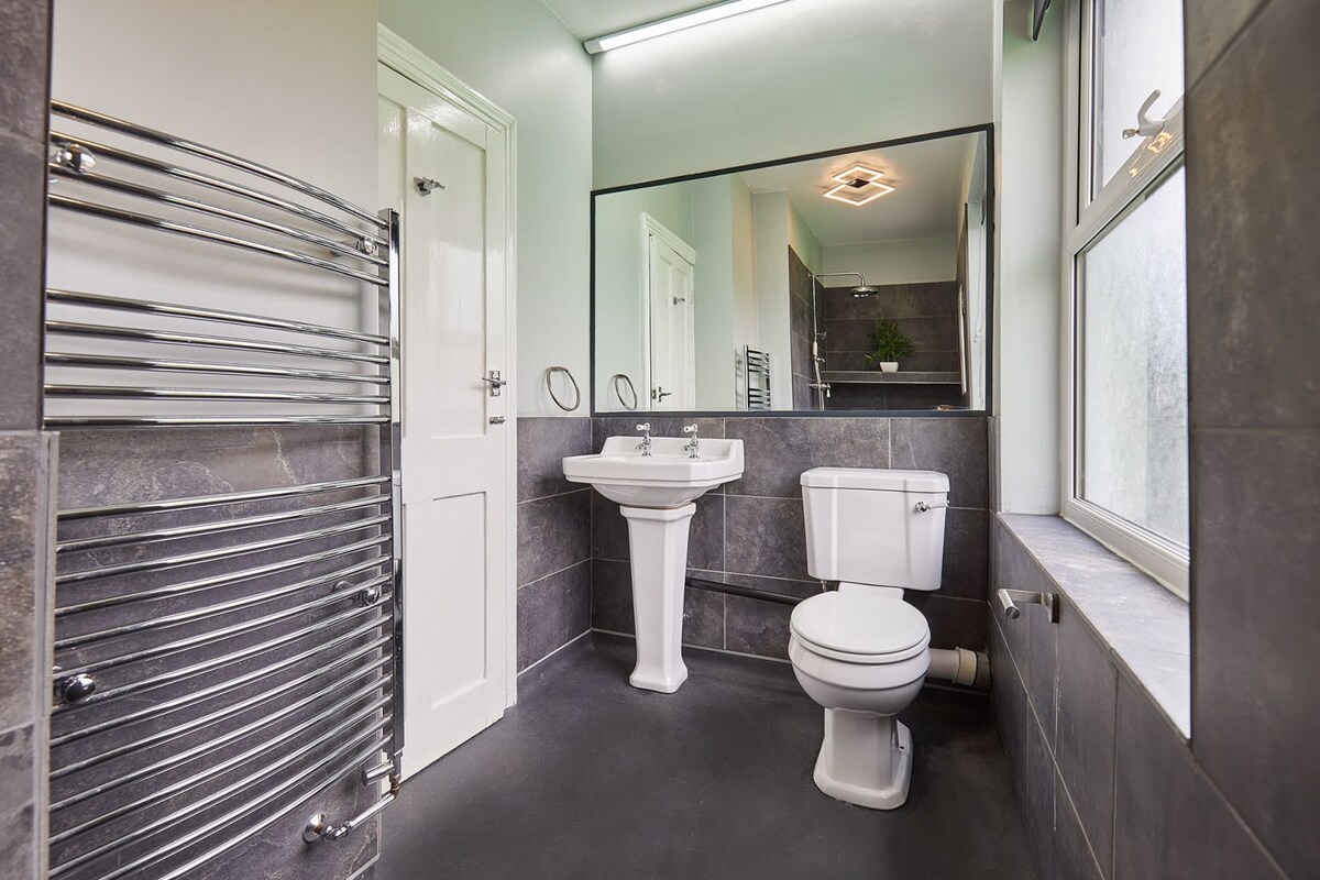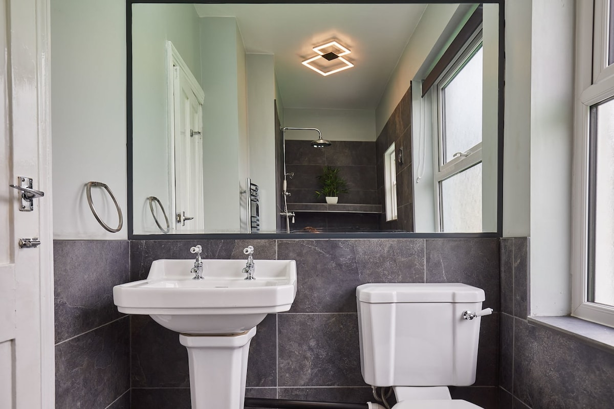 The apartment has a bathroom with a modern interior. It features all of the essential amenities you need, including a walk-in shower, a wash basin, and a WC. You will also find a separate WC in The Old Vicarage.
