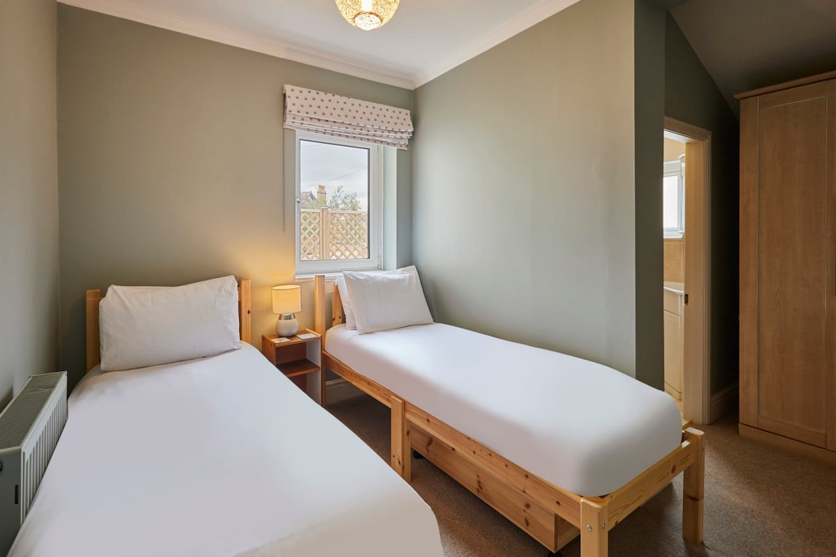 The second bedroom is another traditional space. The comfy twin beds have plush bedding and crisp linens. There is ample storage space as the room has a large wardrobe and chest of drawers.