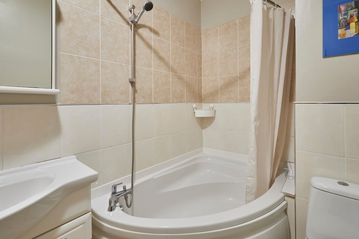 The main bathroom is an ultra-clean and sophisticated space. It boasts a corner bathtub with overhead shower, WC and wash basin.