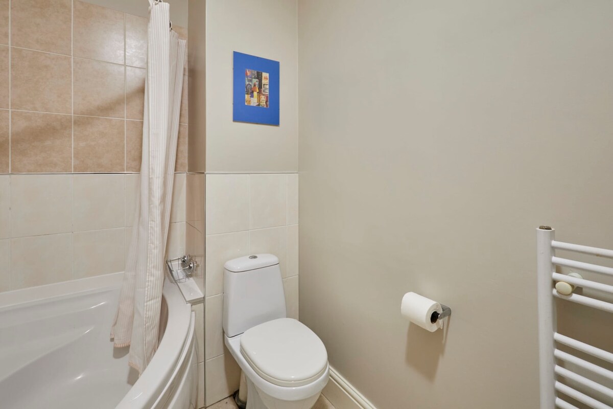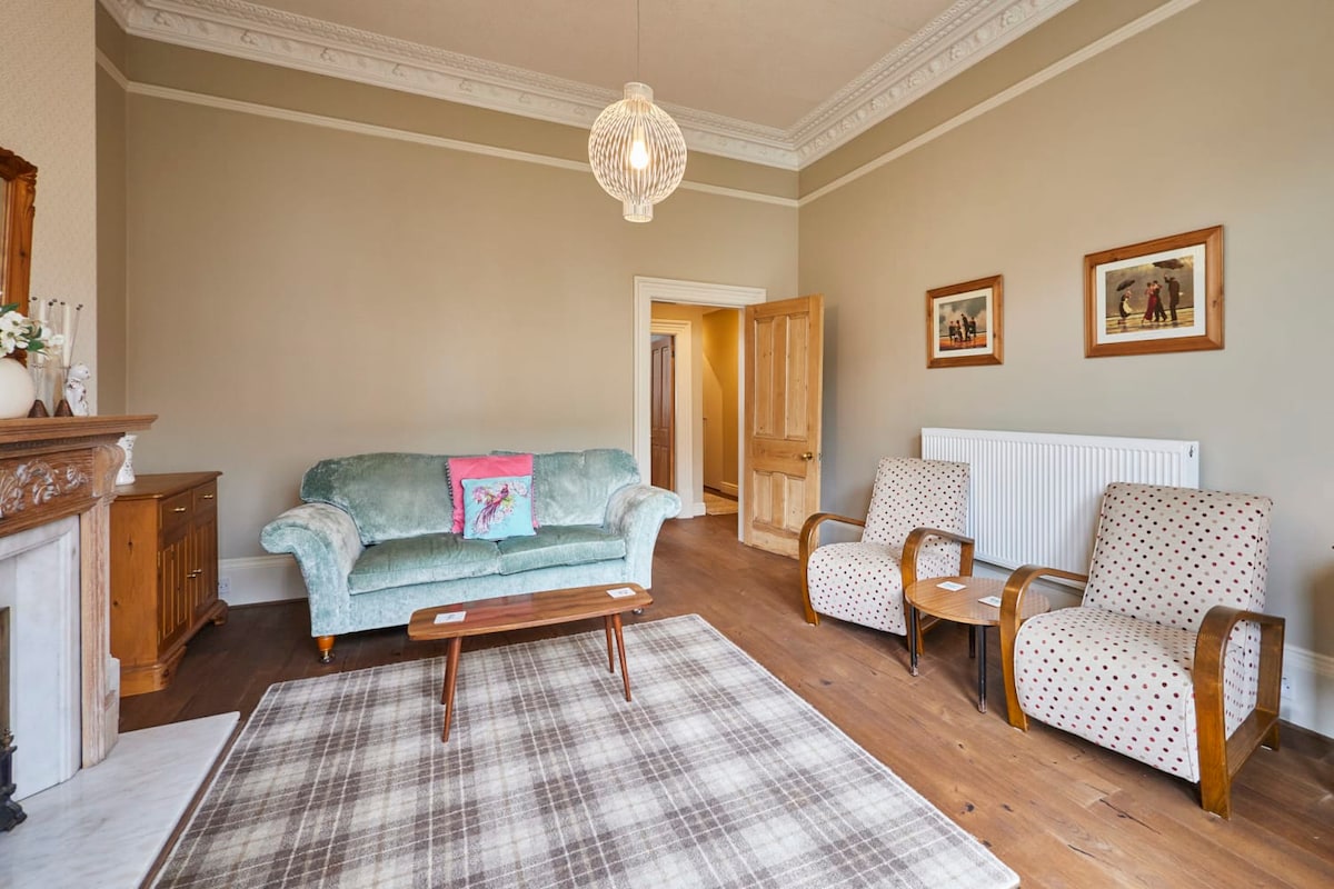 At the beating heart of this apartment is the spacious living room. With neutral tones, a comfy sofa and two armchairs, this space feels comfortable and welcoming. With high ceilings and a bay window, the room is bright and airy. A home from home, you can relax here with your loved ones and enjoy quality time together. There is a TV with Freeview and streaming apps so you can keep on top of your favourite shows during your stay.With light wooden cabinets, smooth black worktops and a beige tiled splashback, the kitchen is traditional in style. Fully equipped for all stays, the kitchen boasts a fridge-freezer, kettle, microwave, oven, hob, and toaster. It also includes the added luxuries of a dishwasher and washing machine.