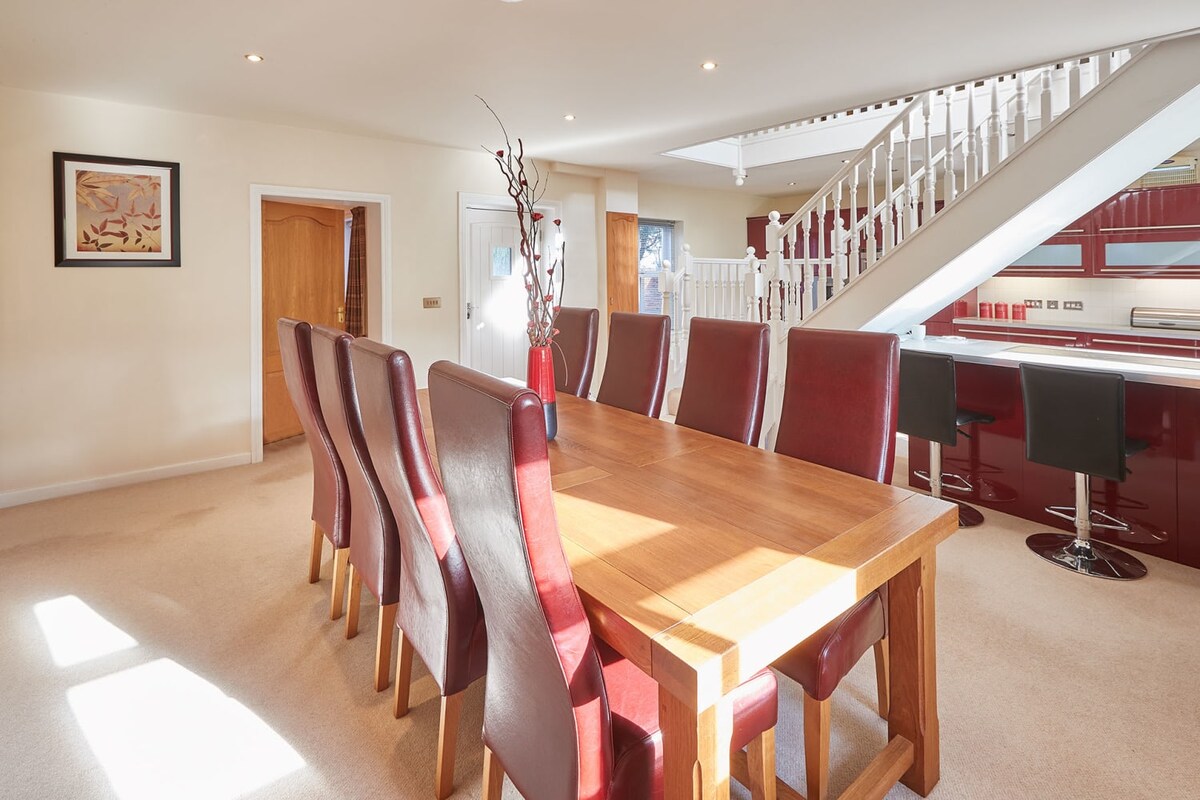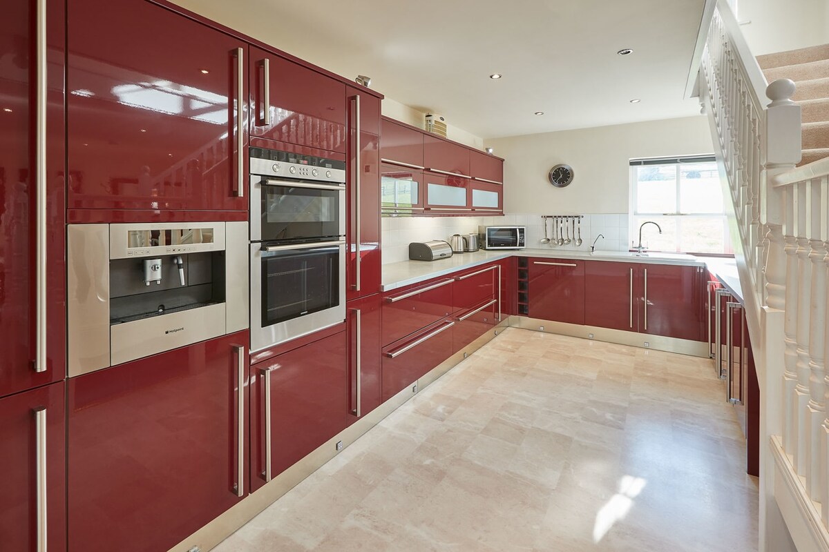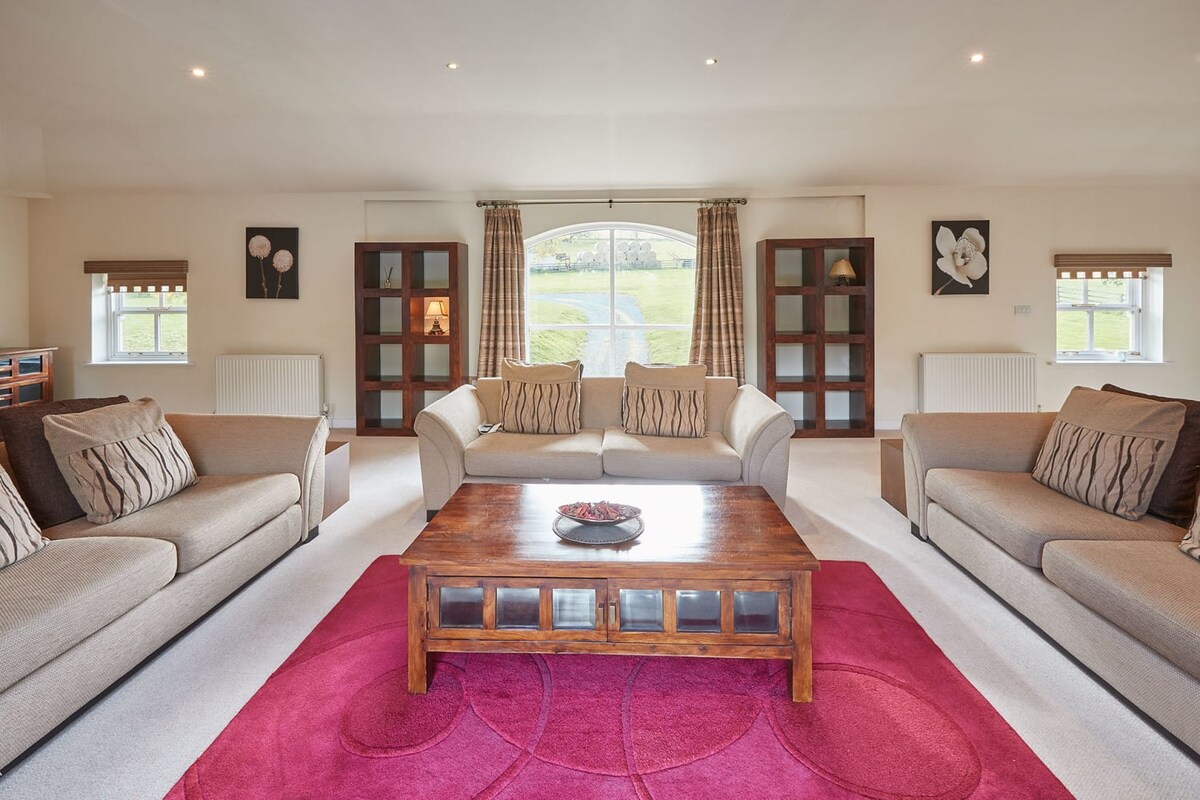 The Stable has a spacious open plan kitchen diner. Modern in style, the kitchen has high shine, oxblood cabinets with integrated appliances. Fully equipped for self-catering stays, you’ll have full use of the oven, hob, coffee maker, microwave, kettle, toaster, fridge, dishwasher, washing machine and dryer. The dining area has a wooden dining table and matching oxblood, leather chairs.The living area is located upstairs and here you’ll find three comfy sofas and a flat screen TV. Ample space for the whole family, you can enjoy a cosy night together and watch your favourite shows on Freeview.