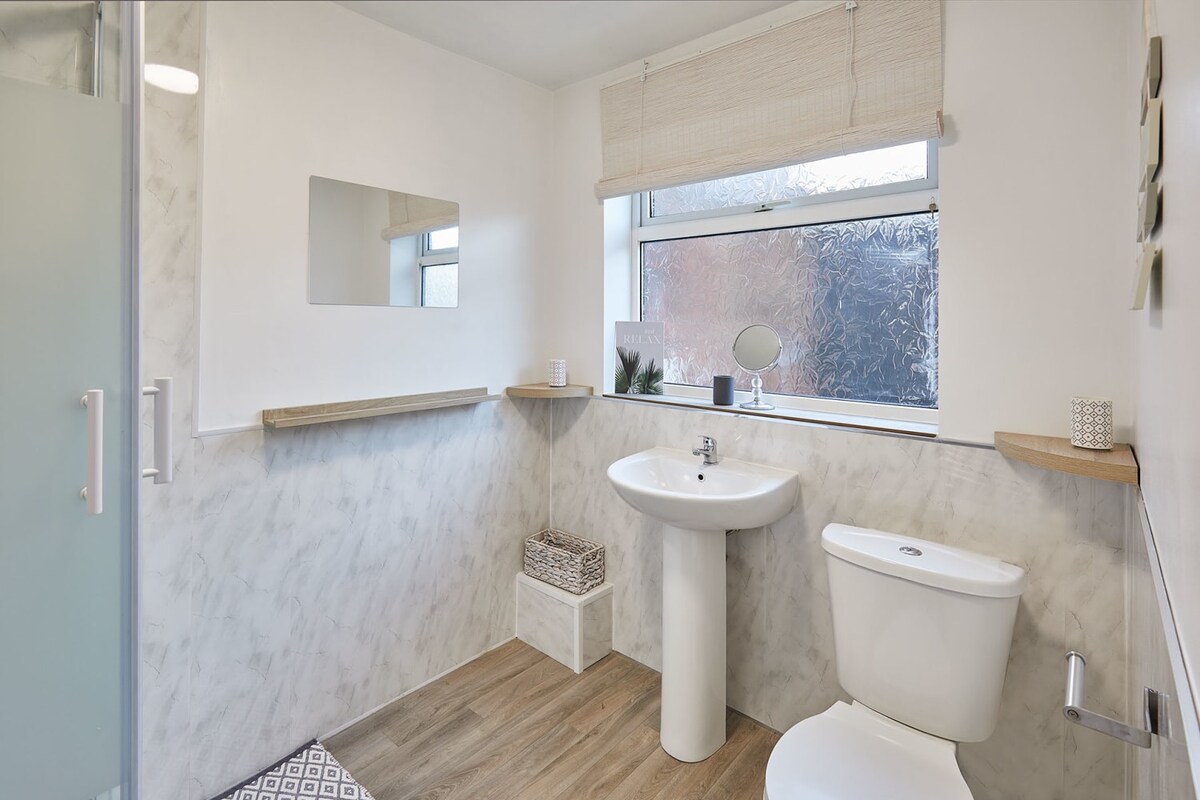 The bathroom is also located on the ground floor. Featuring marble style cladding and crisp white walls, this space is modern and clean. The bathroom includes a walk in shower, WC and basin.