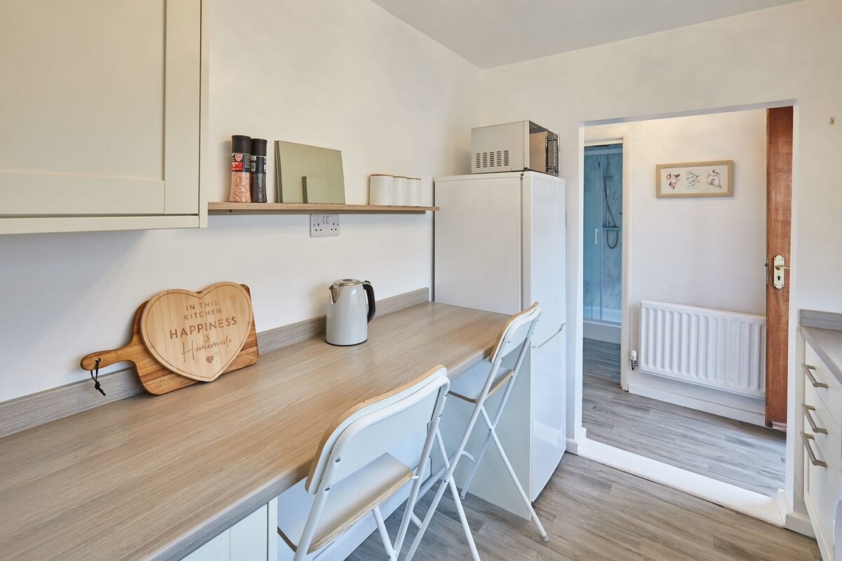 The Railway Cottage has a welcoming and cosy living room. Featuring a comfy sofa, matching armchair and a flat screen TV, this space is ideal for relaxing. Whether you’ve had a fun-filled day exploring North Yorkshire or a busy day working, you can retreat here and unwind.Head to the kitchen and you’ll find a clean, modern space. Amenities include an oven, hob, fridge freezer, kettle, toaster, microwave and washing machine so you have everything you could need for your self-catering stay. Dishes, cutlery and cookware are also provided for your convenience.