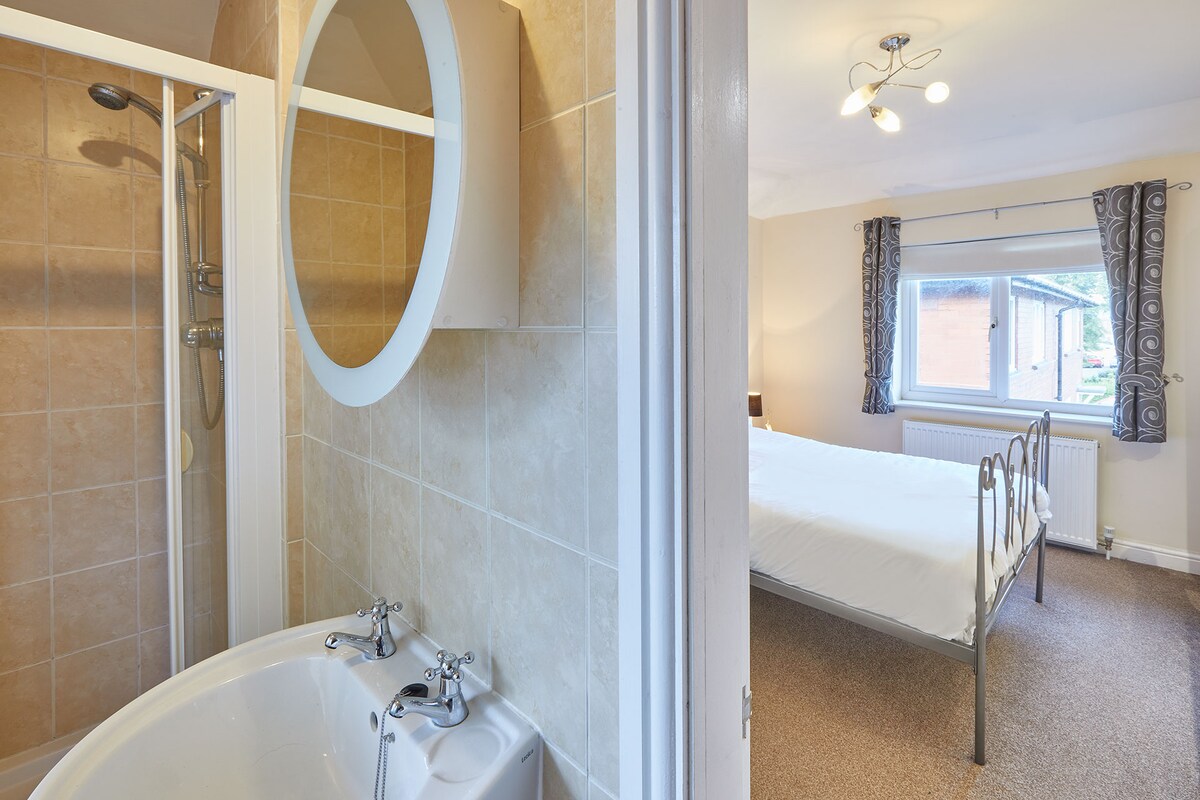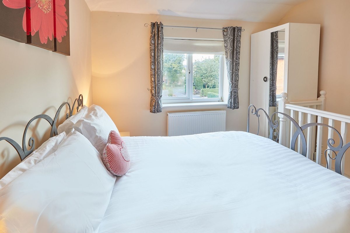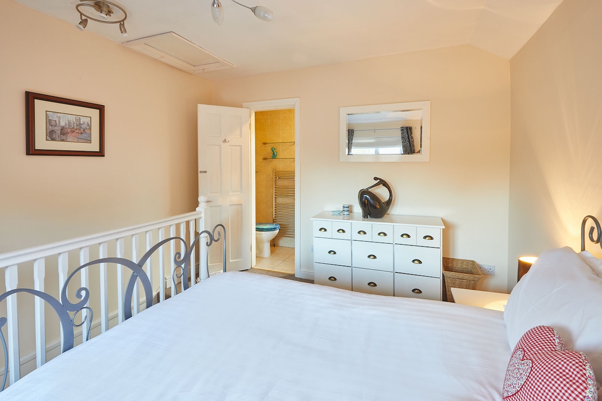 Take the stairs to the first floor where you will find a king-size room with fresh white linen, double wardrobe and a large chest of drawers. Alongside the bedroom is an ensuite shower room.