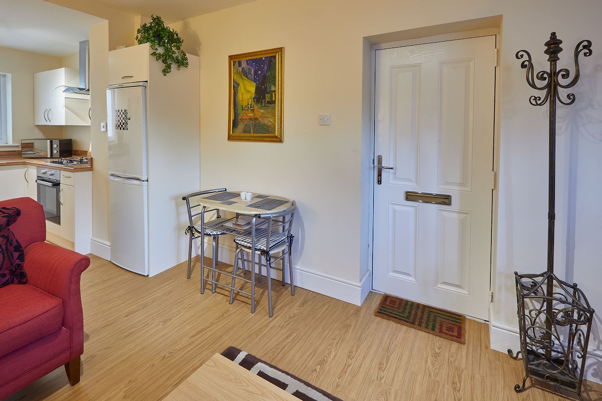 Upon entering the property you are welcomed into an open plan living, dining and kitchen area. Featuring a flat screen Smart TV, this is the perfect space to relax after a day of exploring North Yorkshire. You will also have complimentary access to Netflix thanks to the generosity of the property owner who allows guest access to their account.The fully equipped kitchen has everything you need for your short break. Featuring a gas hob, electrical oven, microwave, fridge freezer and ample storage, you can enjoy a home cooked meal then get comfy in front of the TV.
