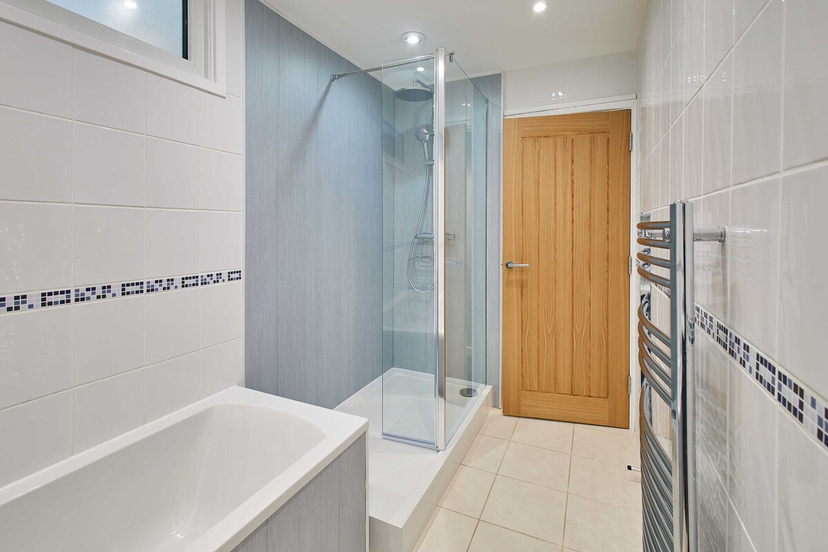 With white, high shine stiped tiles and silver fittings, the family bathroom is an ultra-clean and modern space. It boasts a bathtub with a shower hose, a separate walk-in shower, along with a WC and basin.