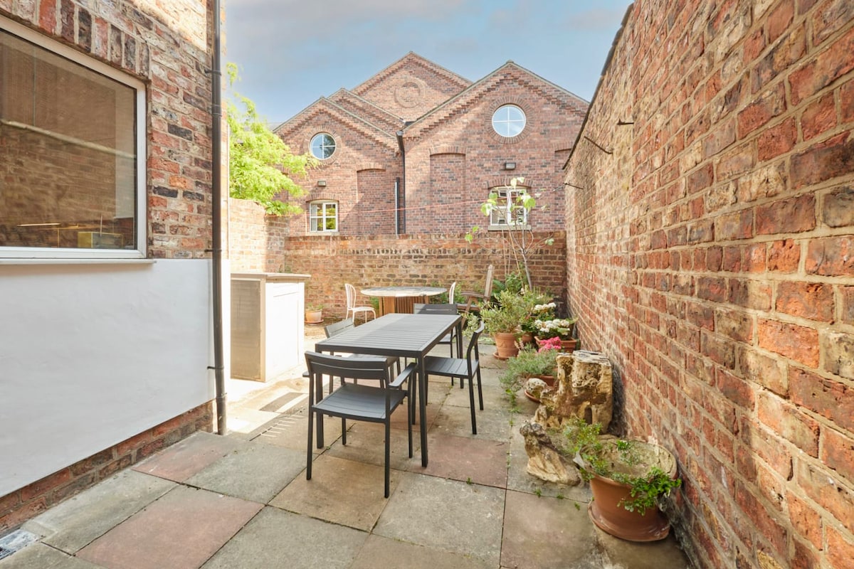 Outside you’ll find a walled courtyard with outdoor furniture including a garden table and chairs where you can relax on sunny days and warm evenings. A washing line is also available.