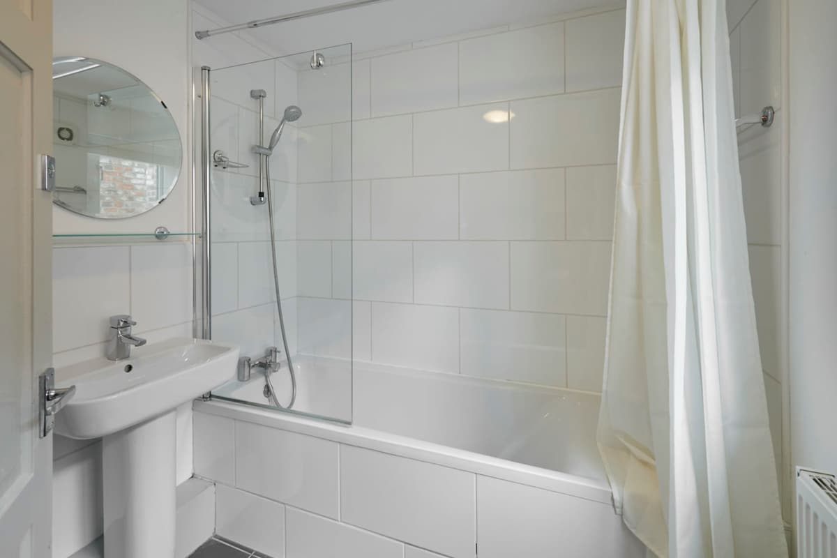 Head to the family bathroom and you’ll find a bathtub with overhead shower, WC and wash basin. Featuring white, high shine tiles and slate grey flooring, this space is modern and stylish.